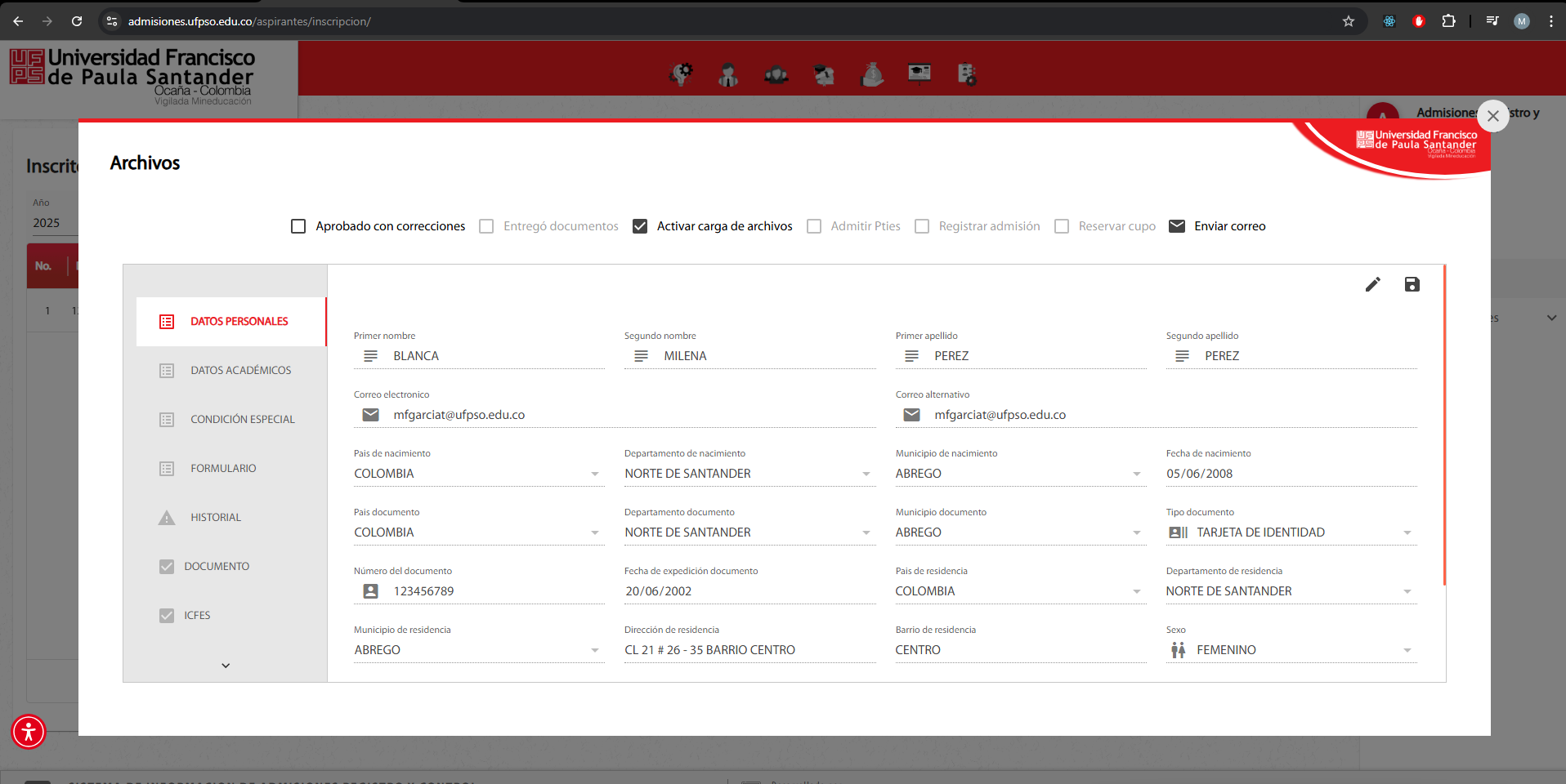 Al presionar el icono de archivo se podrá visualizar una flotante que permita modificar datos y consultar archivos del aspirante: