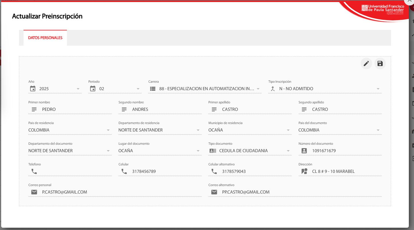 Al presionar el icono previsualizar podemos observar una flotante con un formulario que va a permitir modificar los datos de preinscripción de un aspirante, para activar los campos a modificar debe presionar el icono de editar y cuando los campos estén modificados se debe presionar el icono guardar para que se editen correctamente los datos.