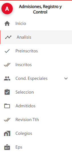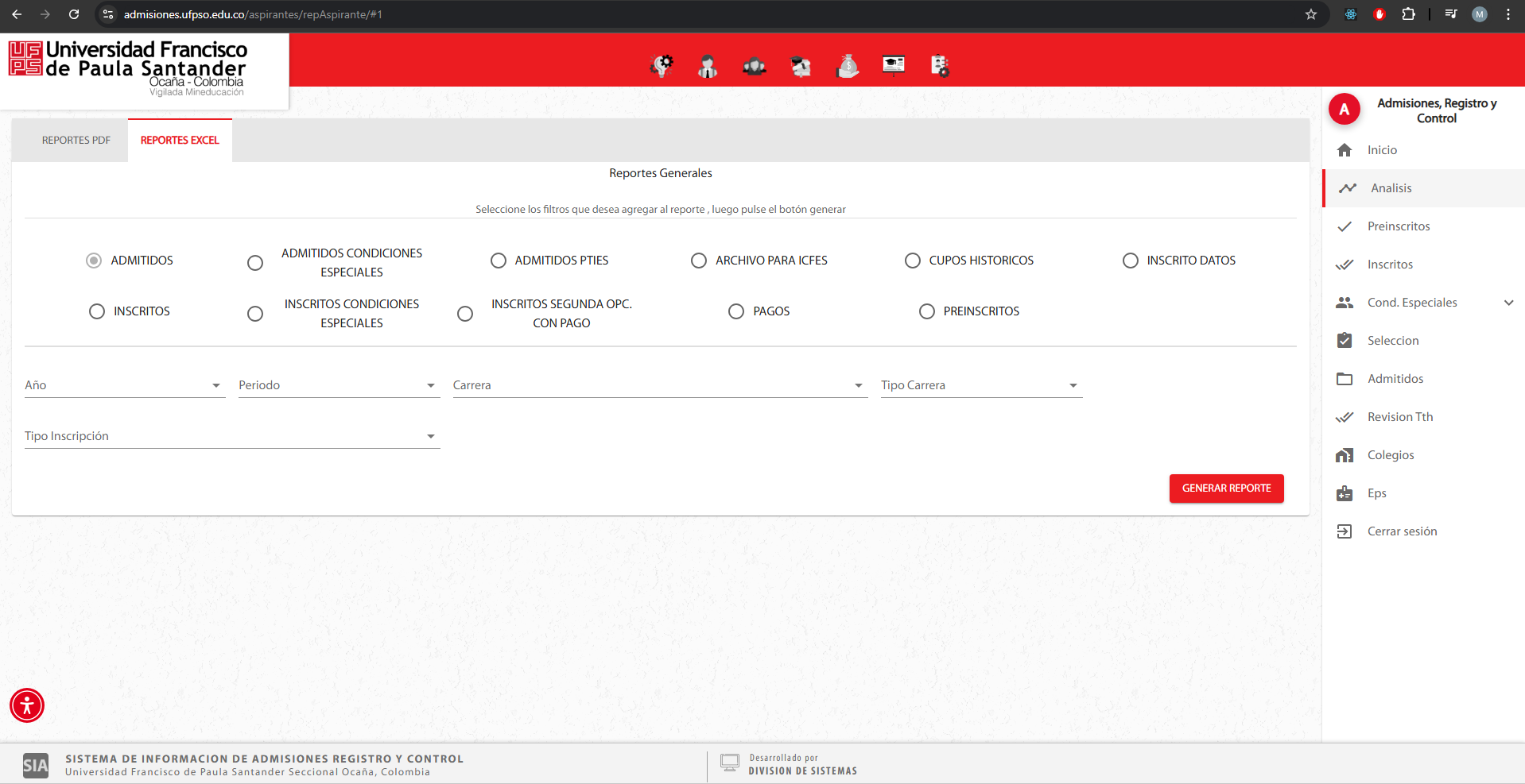 Análisis:Permite consultar información general representada en gráficas y reportes sobre los aspirantes.