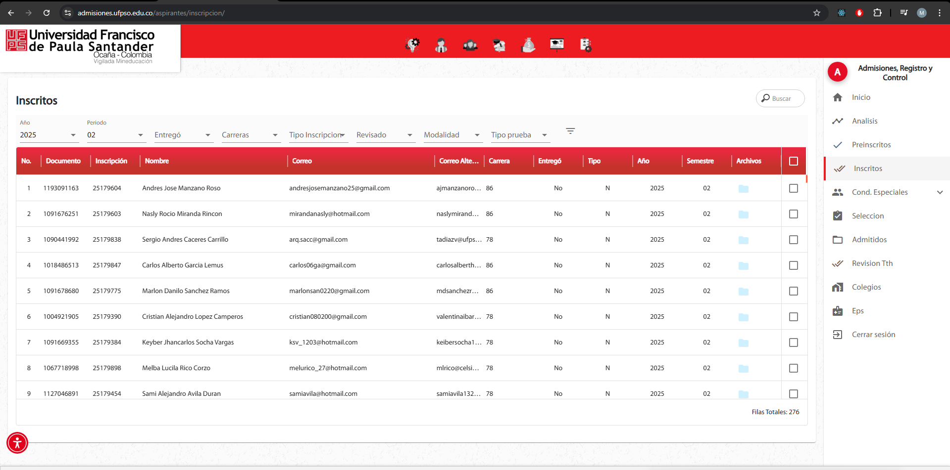 En la opción de inscritos se puede consultar la información de los aspirantes que se han inscrito hasta la fecha actual, también se puede actualizar la información registrada por los aspirantes si es necesario.