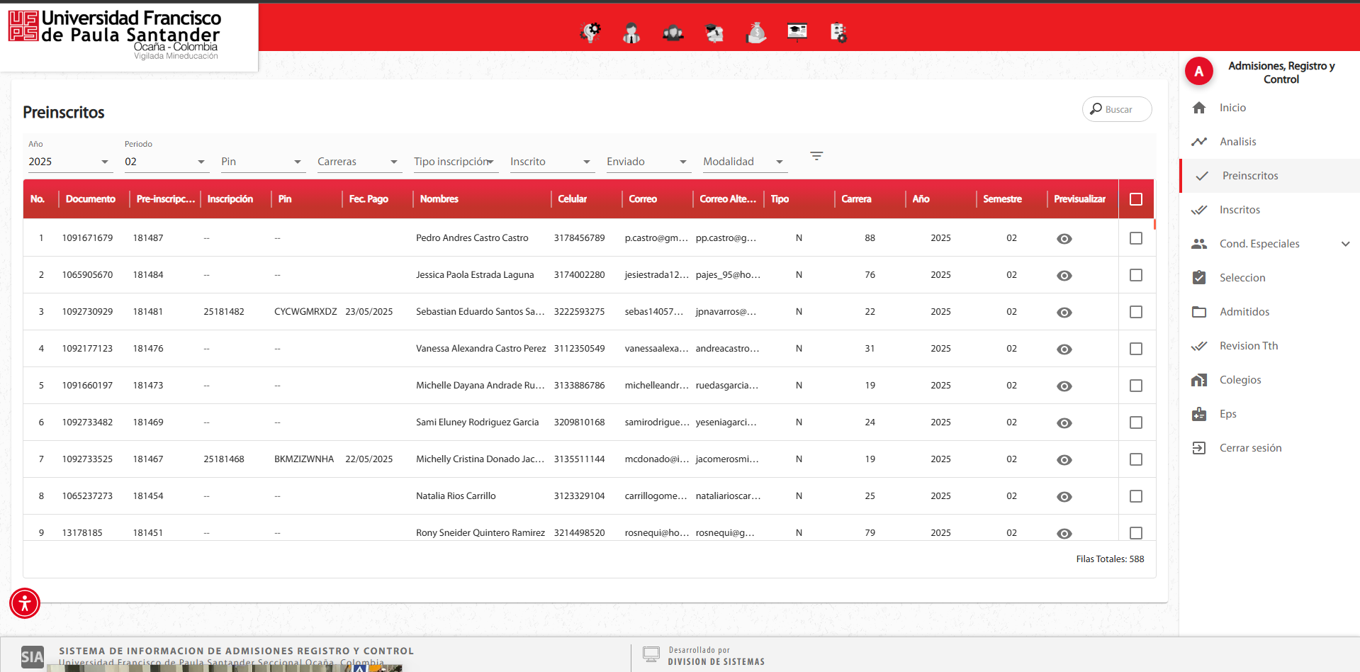 Preinscritos:Esta opción permite consultar la información de los aspirantes preinscritos y modificar los datos necesarios a petición del aspirante o según los documentos en la plataforma.