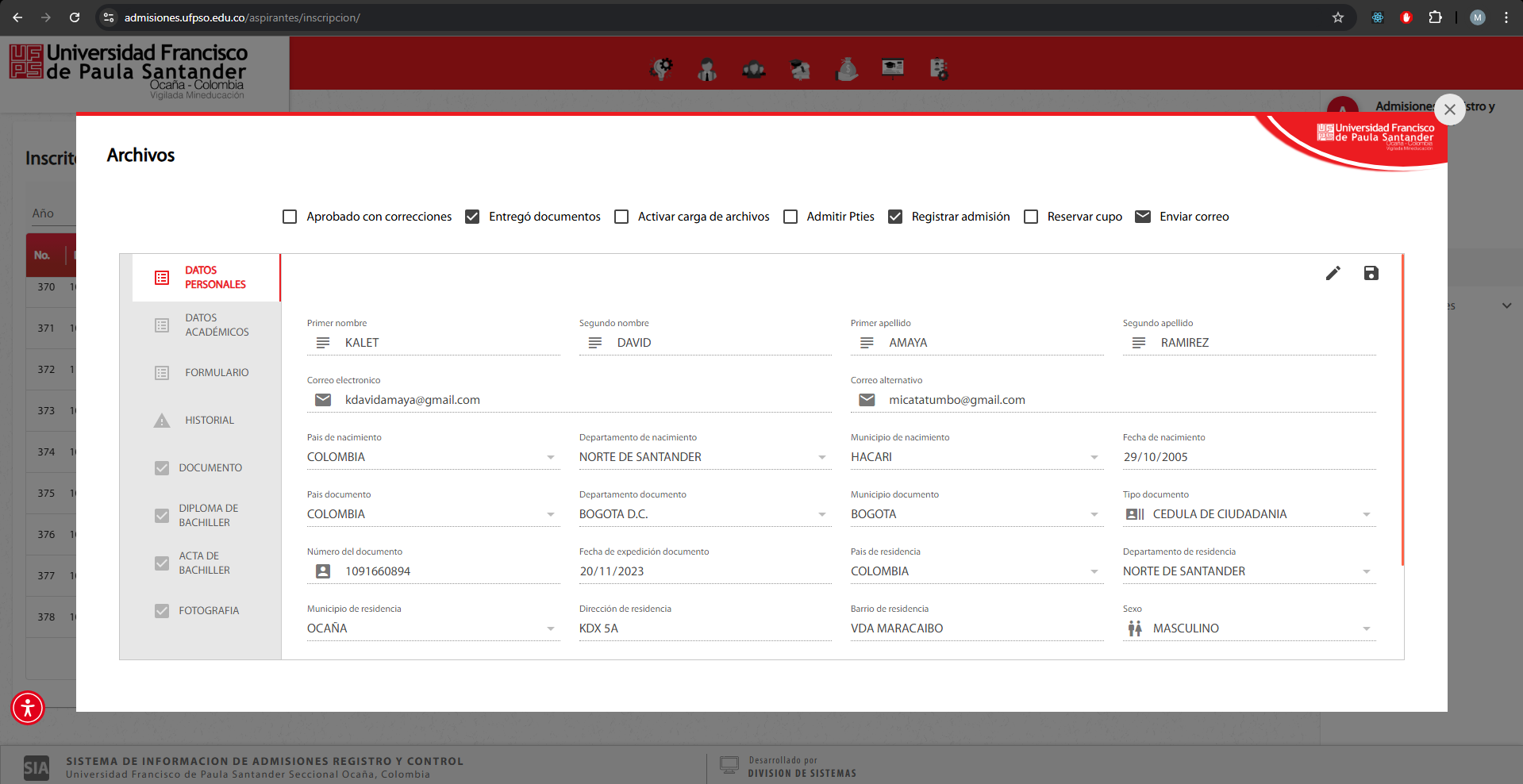 Admitidos: Permite visualizar la información de los admitidos y los archivos solicitados para su expediente académico.