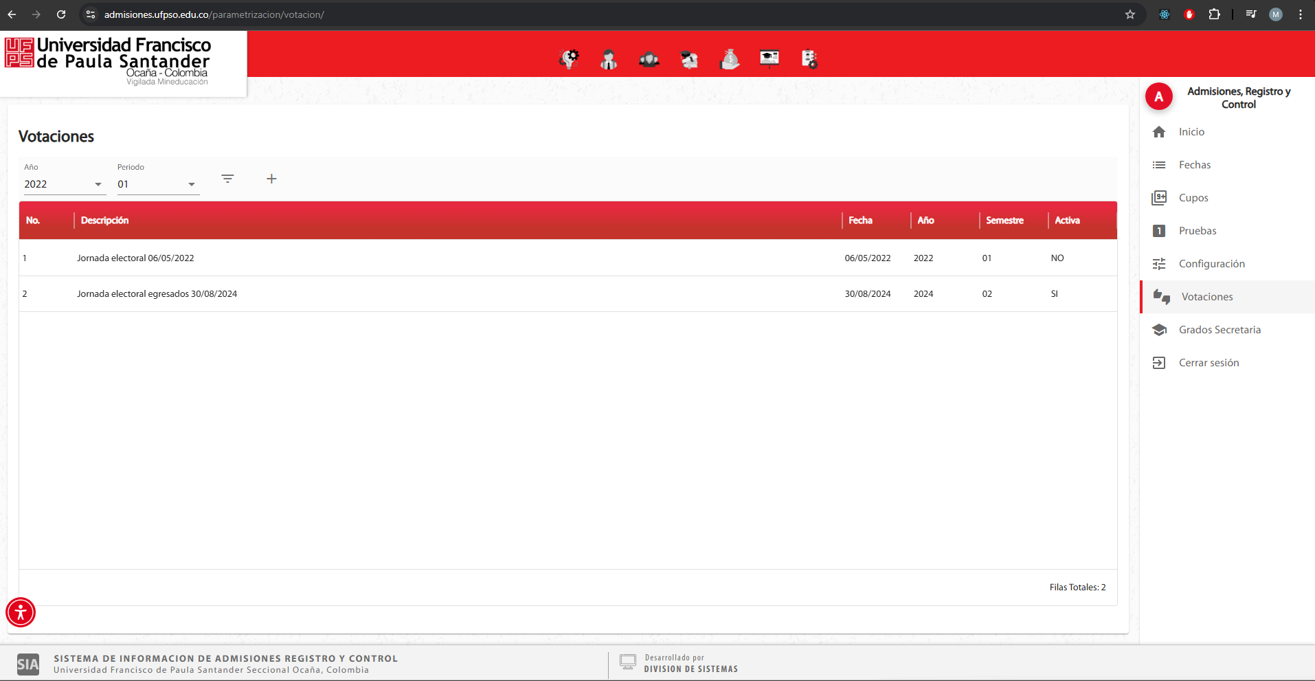 Votaciones: Permite visualizar y registrar la información de las votaciones de egresados.