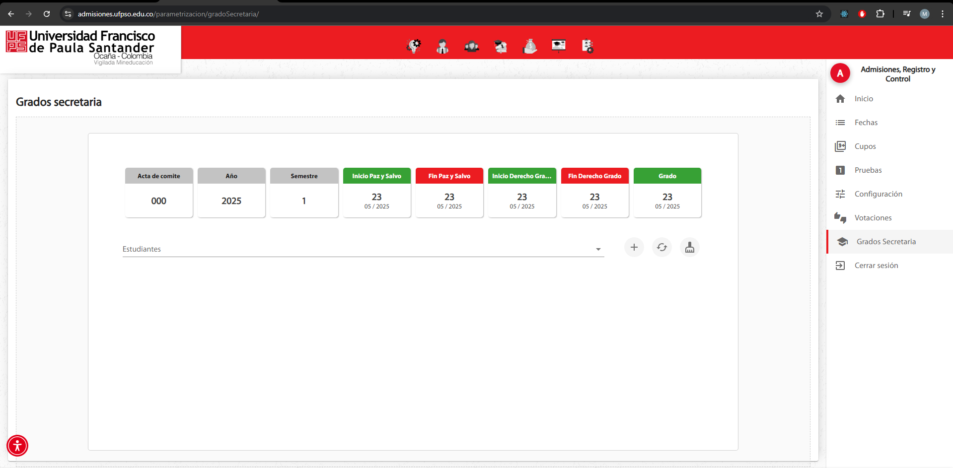 Inicialmente si se desea consultar una de las fechas historicas del grado por secretaria se selecciona la fecha, en caso de que se desee configurar una nueva se cierra la ventana flotante: