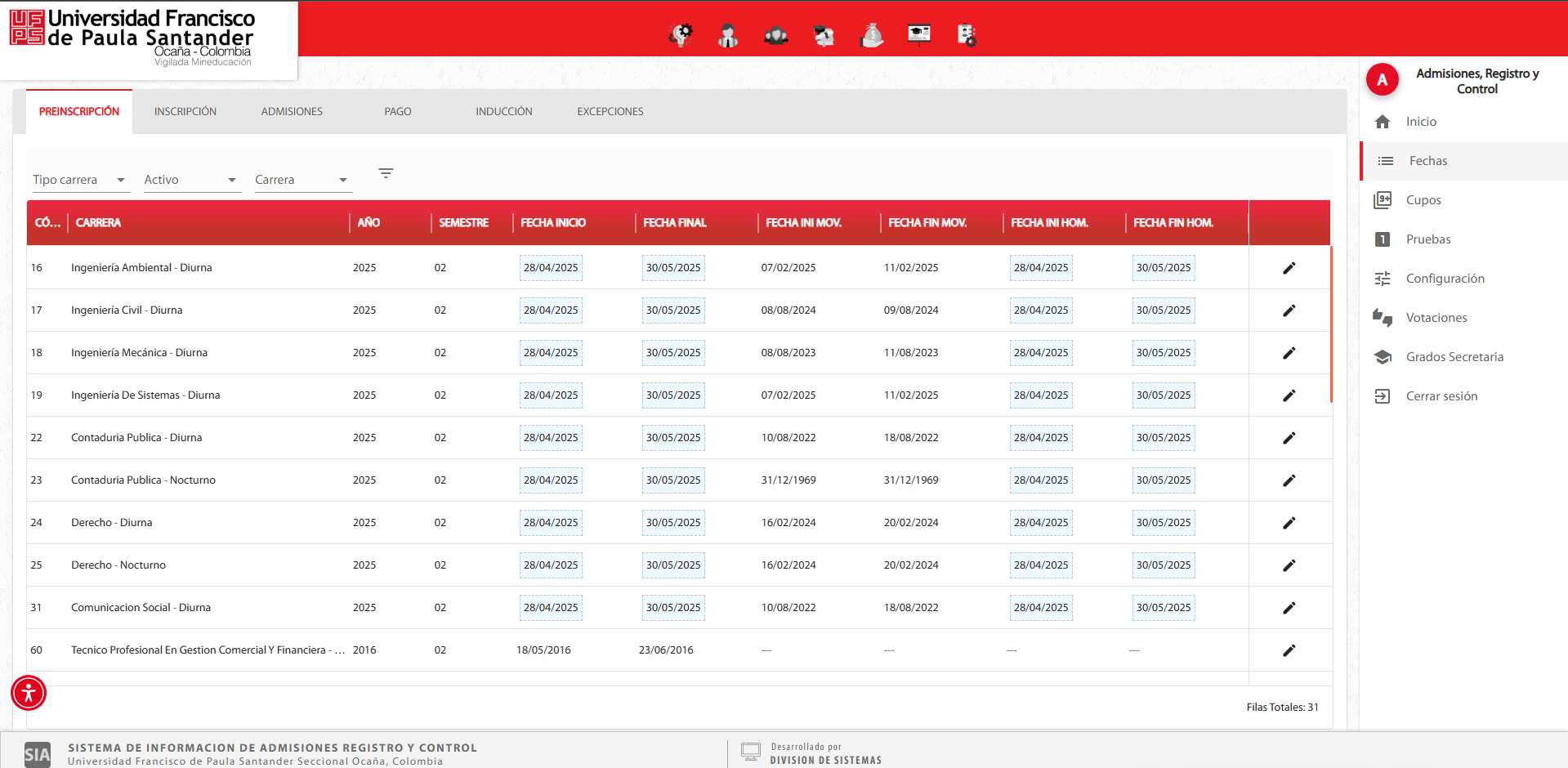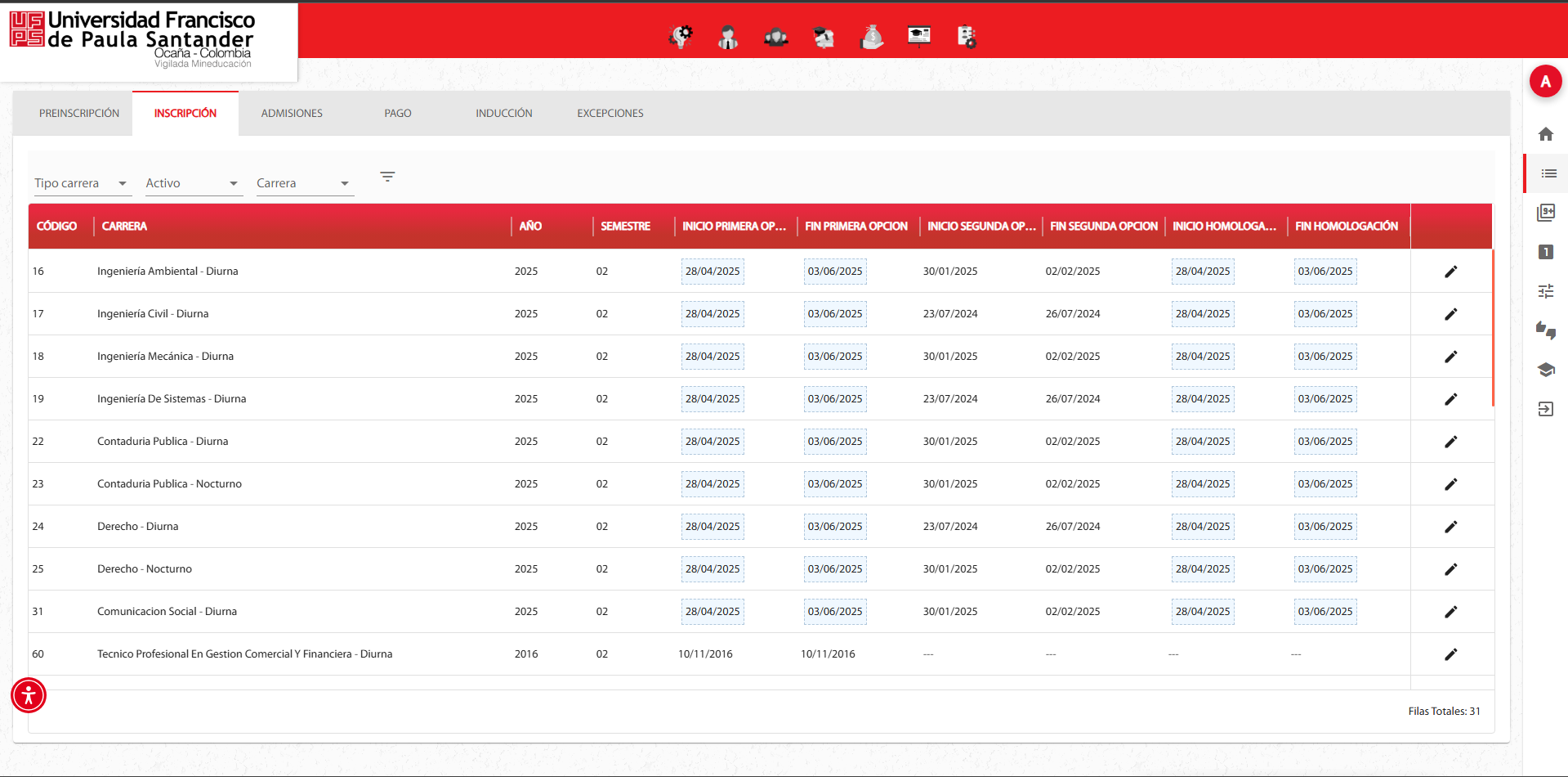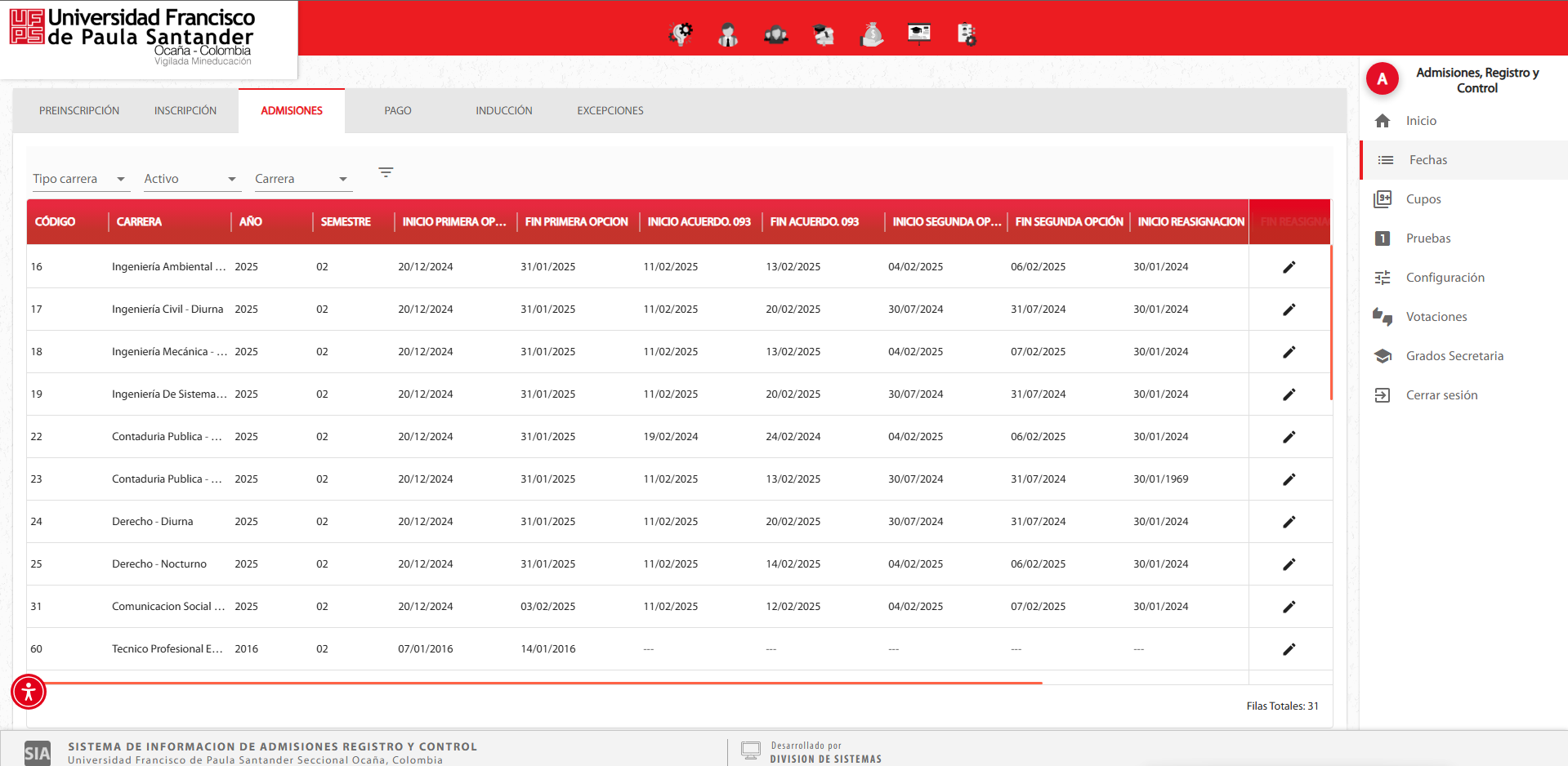 Fechas:Esta opción permite visualizar y editar las fechas de cada programa académico.