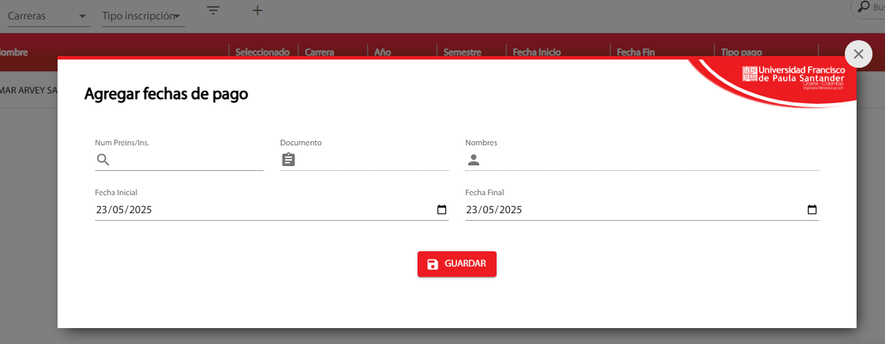 Para registrar un aspirante con fechas de pago extraordinarias se debe ingresar el número de preinscripción o inscripción y especificar el rango de fechas que se desea otorgar para realizar el pago.