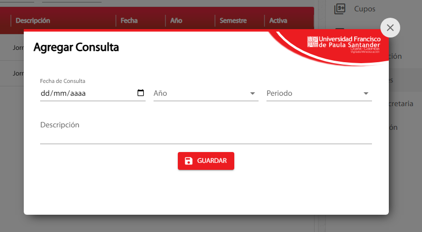 Para registrar una jornada electoral se debe diligenciar el siguiente formulario, con la fecha de consulta, año, periodo y descripción.