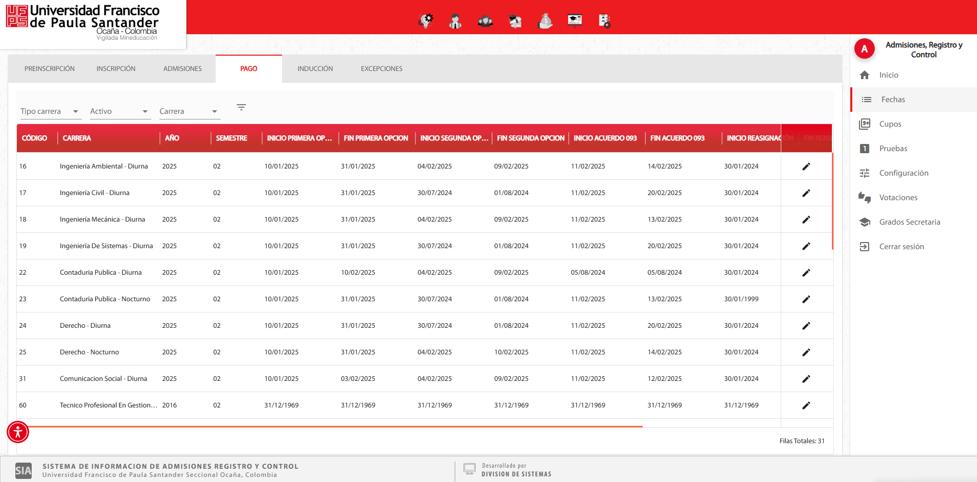 En la pestaña de pagos se pueden visualizar y editar las fechas de inicio y fin para el proceso de pago para los aspirantes de primera opción, segunda opción, reasignación y homologación.