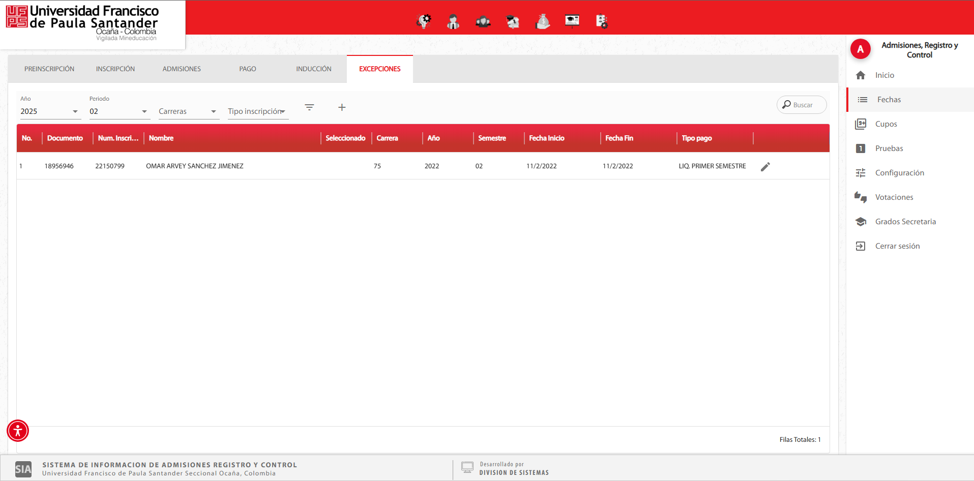 En la opción de excepciones se pueden consultar y registrar los aspirantes que por algun motivo pagaran en fechas extraordinarias a las parametrizadas en el sistema.