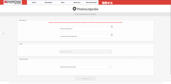 En esta sección el sistema solicita al aspirante ingresar el Registro SNP de las Pruebas Saber 11. Este código es el identificador único del resultado de las pruebas de Estado que el aspirante presentó ante el ICFES. Es importante tener en cuenta las siguientes condiciones de vigencia según el tipo de programa y la sede: