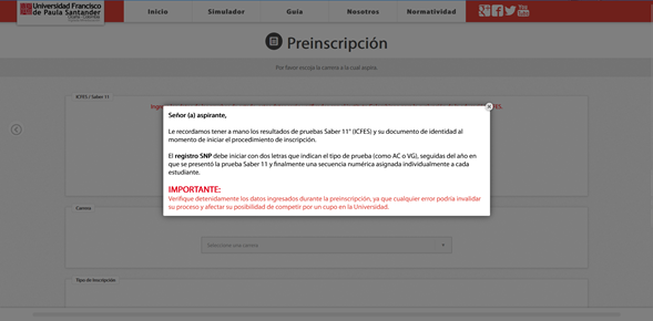 Al seleccionar la opción Carreras Pregrado dentro de la modalidad Presencial, el sistema despliega de forma automática una ventana flotante con indicaciones de carácter obligatorio que el aspirante debe leer y tener en cuenta antes de continuar con el proceso. Este aviso detalla las condiciones generales del proceso de preinscripción, las políticas de la institución, los requisitos previos de elegibilidad y las advertencias sobre la veracidad de la información suministrada. El aspirante debe leer cuidadosamente el contenido de esta ventana y confirmar su aceptación para poder avanzar al siguiente paso del proceso.