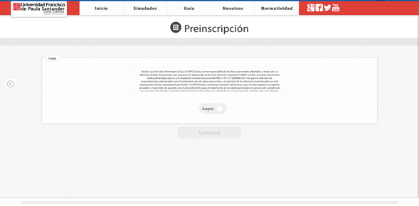 Una vez diligenciados correctamente todos los datos personales y de contacto, el sistema despliega una declaración de carácter legal en la que el aspirante certifica la veracidad de la información suministrada y acepta los términos y condiciones del proceso de preinscripción de la Universidad. Para continuar, el aspirante debe hacer clic en el botón Aceptar. Una vez aceptada la declaración, el sistema redirige al aspirante a la sección de pago del PIN de inscripción, donde podrá escoger la modalidad de pago que mejor se ajuste a su situación. Las opciones disponibles para efectuar el pago son: