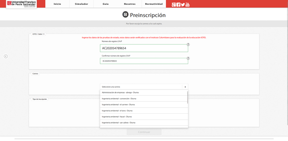 Una vez ingresado el código SNP válido, el sistema lo valida automáticamente y despliega una lista desplegable con los programas académicos disponibles para los que el aspirante puede aplicar, de acuerdo con su puntaje y las condiciones de admisión vigentes para el periodo correspondiente.