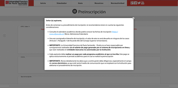 Ventana flotante – Aviso de condiciones generales del proceso de preinscripción