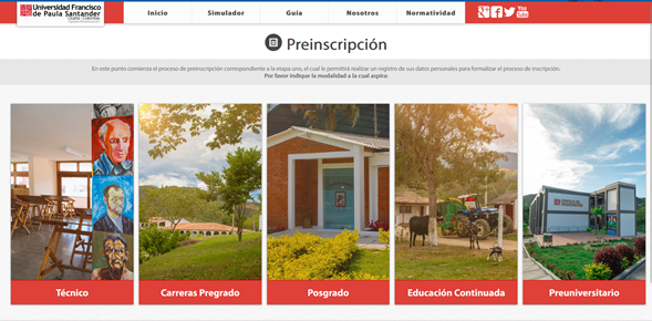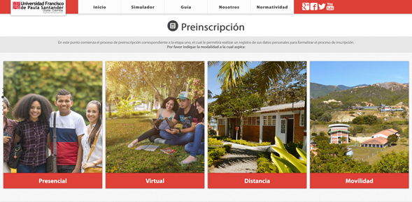 Al ingresar al módulo de preinscripción, el sistema presenta al aspirante las diferentes modalidades de inscripción disponibles según la naturaleza del programa académico de interés. Las modalidades disponibles son: Presencial, Virtual, Distancia y Movilidad. Cada modalidad agrupa los programas académicos que se ofrecen bajo ese esquema de formación, permitiendo al aspirante navegar hacia la opción que corresponda a su situación y al programa al que desea postularse.