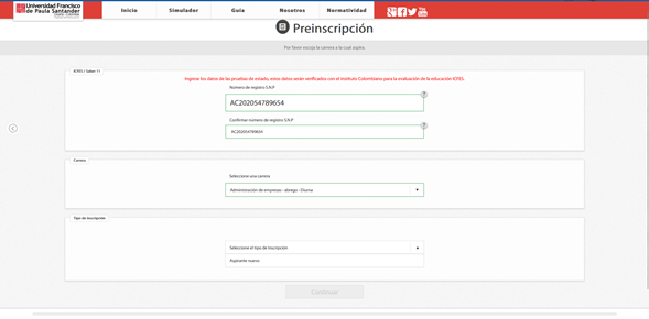 Después de que el sistema valida el código SNP, se habilita una lista desplegable en la que el aspirante debe seleccionar el programa académico al que desea postularse y concursar por un cupo. El sistema presenta únicamente los programas para los que el aspirante cumple los requisitos de vigencia de la prueba Saber 11. Adicionalmente, debe seleccionarse el Tipo de Inscripción que corresponda a la situación académica del aspirante. Las opciones disponibles son: