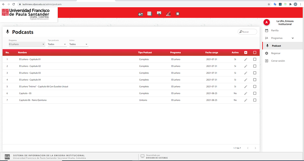 En la opción de podcasts se puede consultar la información de los podcasts registrados en la emisora institucional.