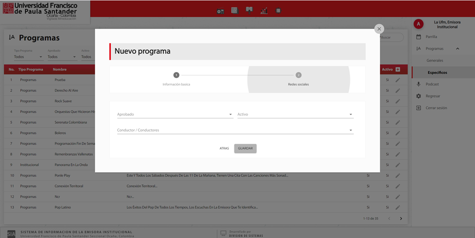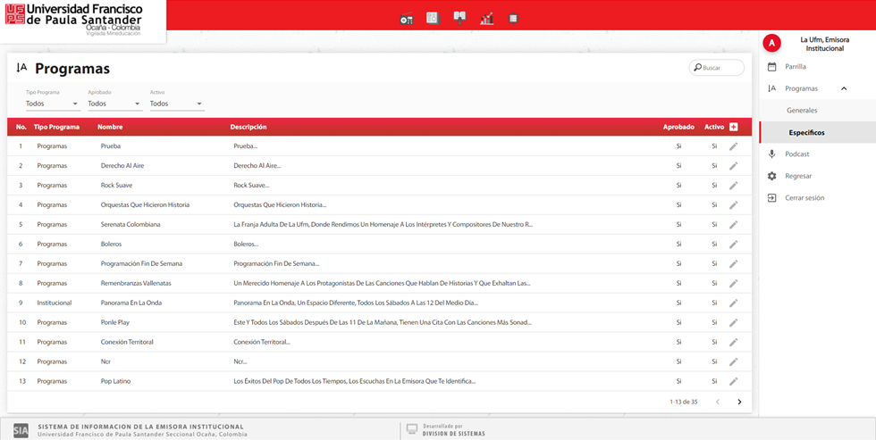 Aprobado: Corresponde al estado aprobado de un programa en la parrilla, indicando si está activo o no en el portal de la emisora institucional.