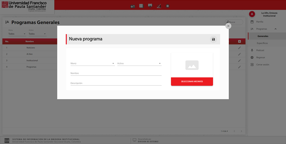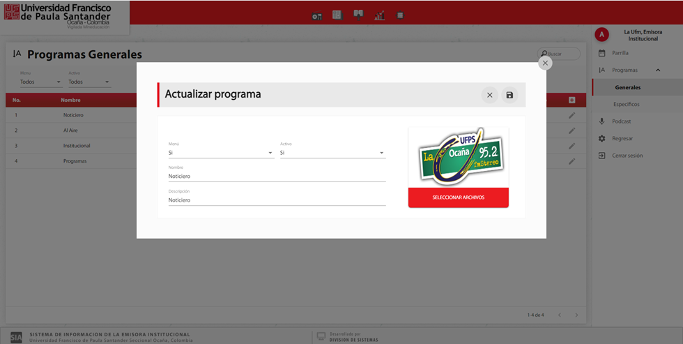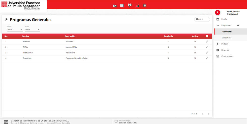 En el submenú programas, en la opción de generales se puede consultar la información de los programas generales registrados en la emisora institucional.