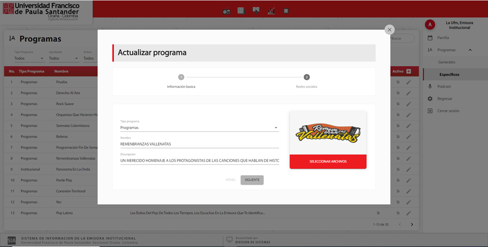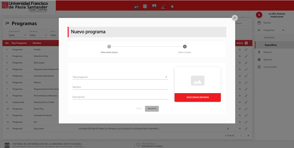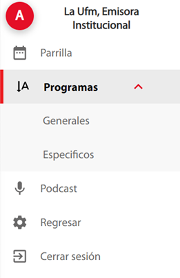En el submenú programas, en la opción de especifico se puede consultar la información de los programas específicos registrados en la emisora institucional.