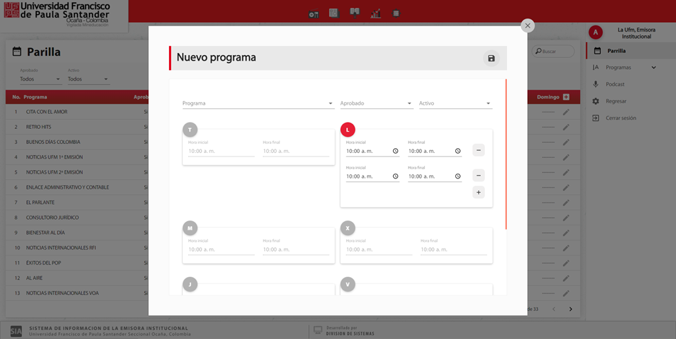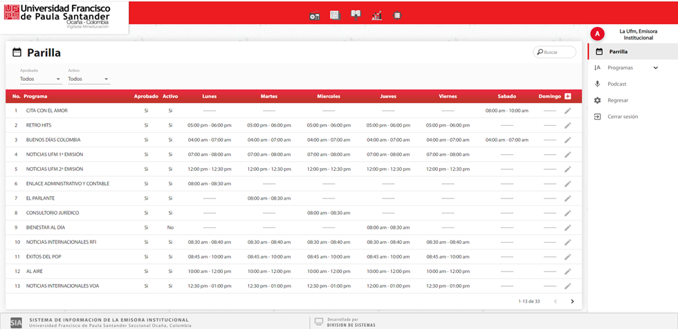 En la opción de parrilla se puede consultar y actualizar la programación de los programas registrados en la emisora institucional.