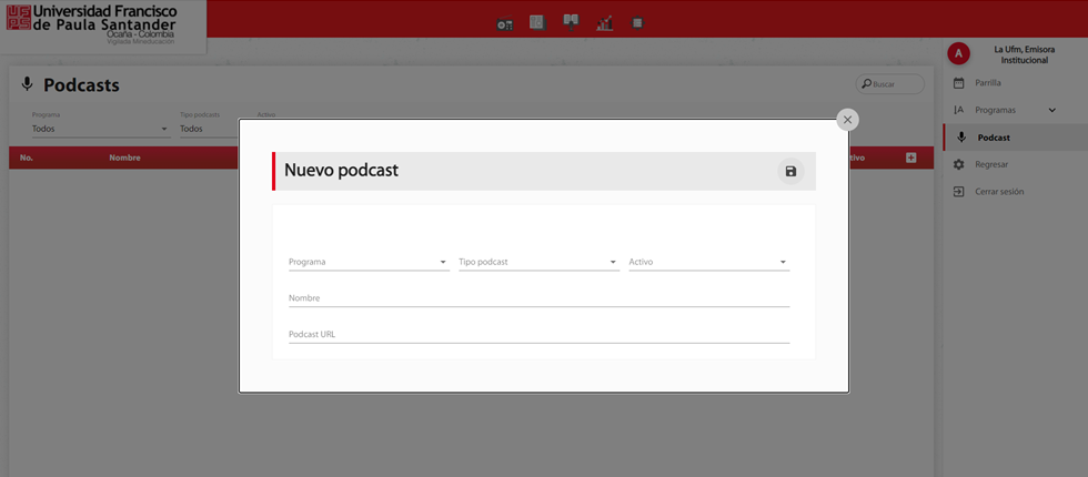 Al presionar el icono agregarpodemos observar una flotante con un formulario de registro para crear un nuevo podcast. Posteriormente cuando desee guardar la información diligenciada en el formulario debe presionar el botón “Guardar”.