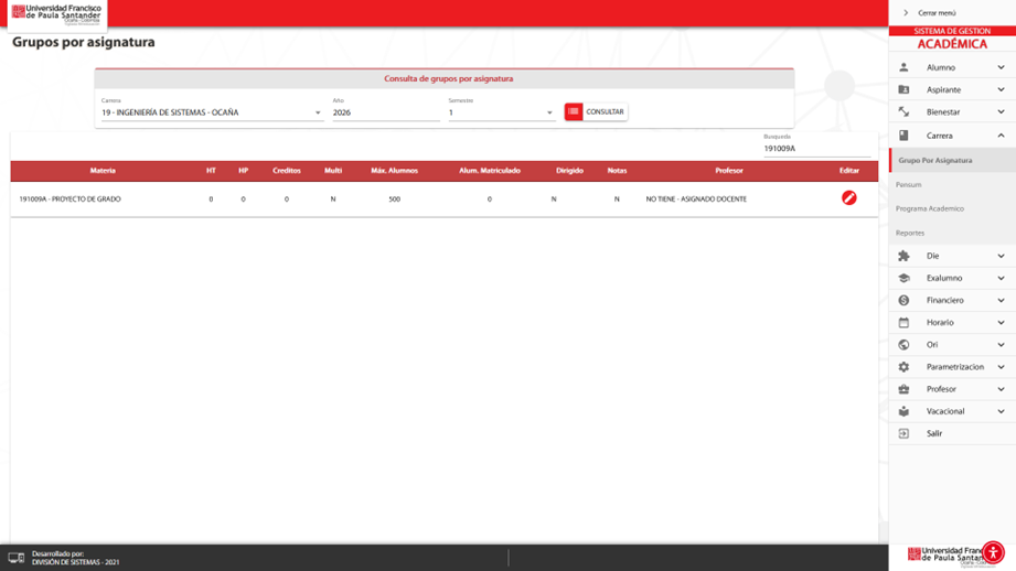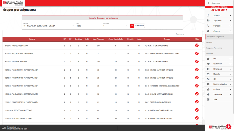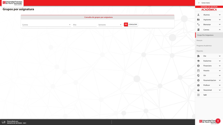 Una vez completados todos los campos, se debe hacer clic en el botón Consultar. El sistema generará una tabla con la información académica de las materias correspondientes al año y semestre seleccionados.