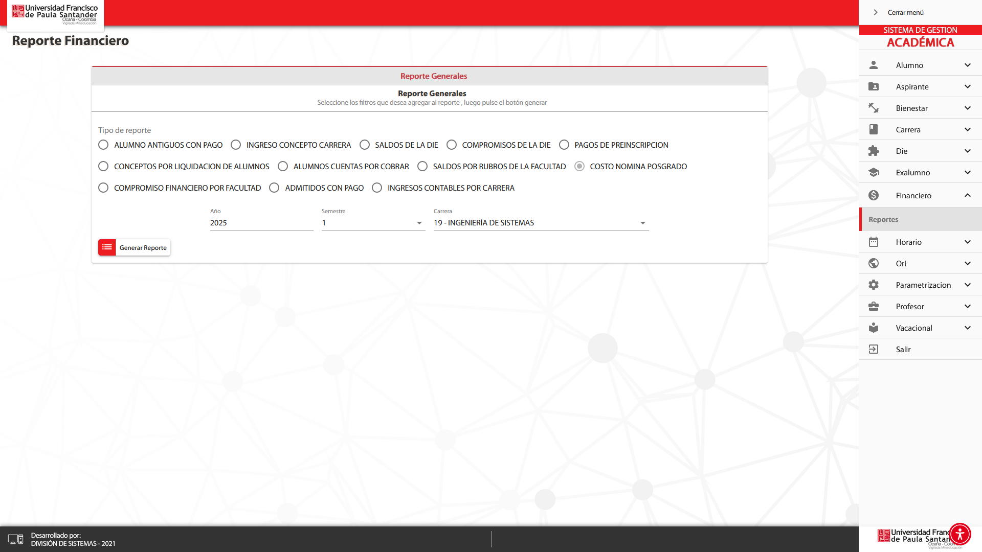 En este apartado usted encontrará una sección principal: Reporte General, donde es posible generar distintos reportes académicos.