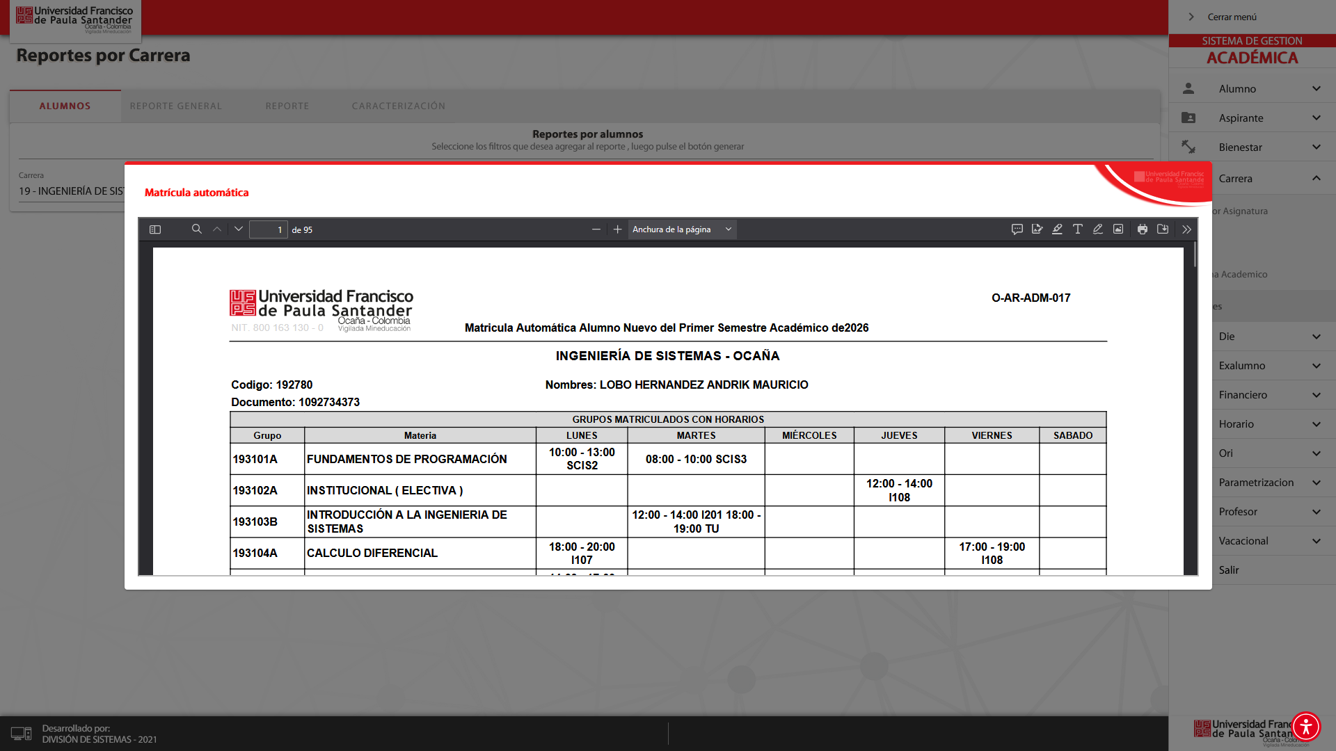 Al seleccionar esta opción, se generará un listado de los estudiantes de primer semestre, incluyendo su horario y todas las materias asignadas a través del proceso de matrícula automática.