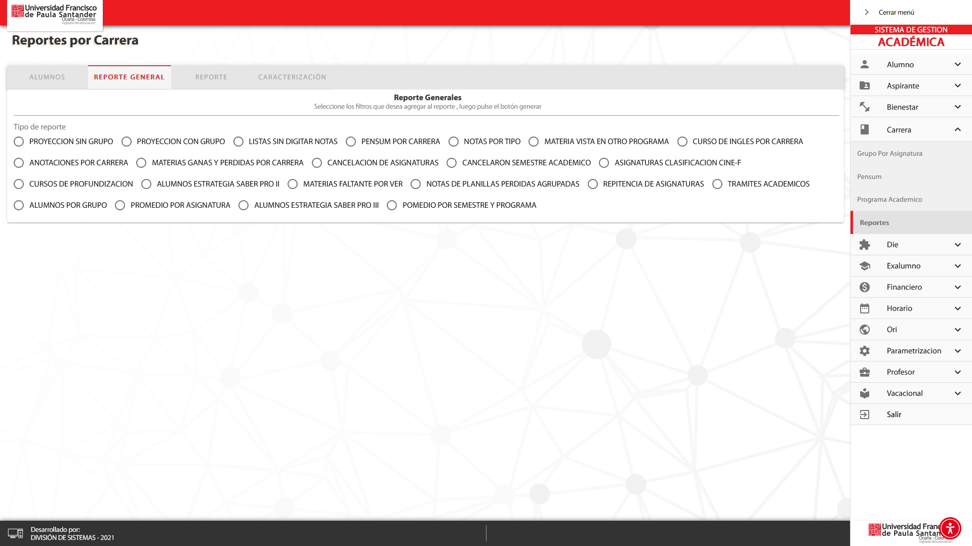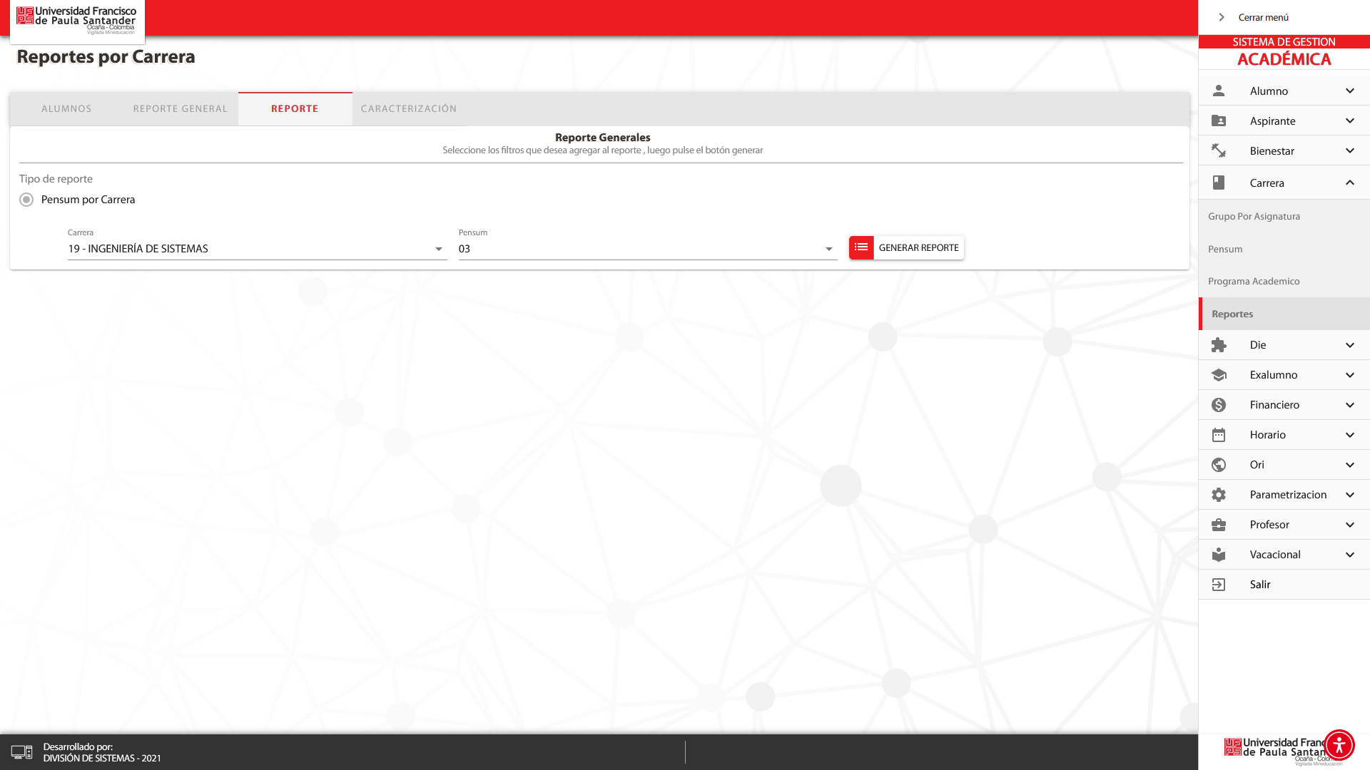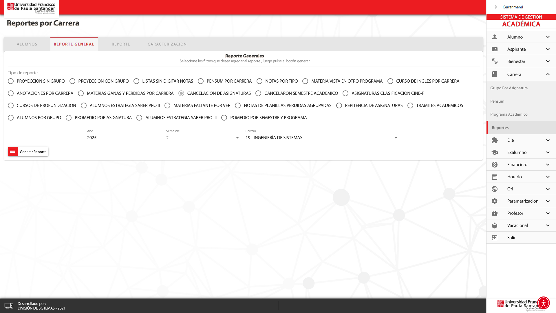 En esta sección se pueden generar reportes relacionados con los estudiantes, según la carrera seleccionada.