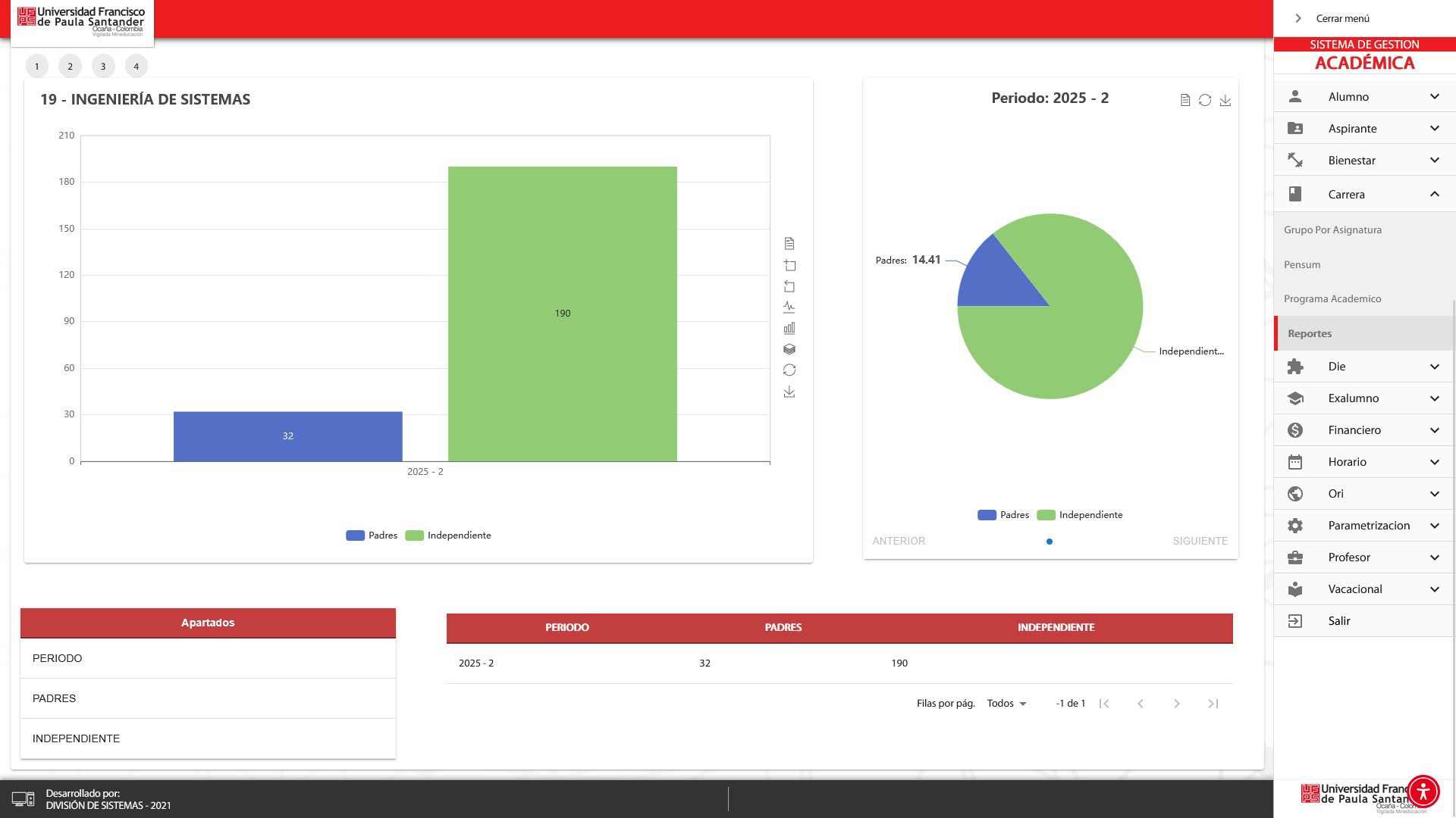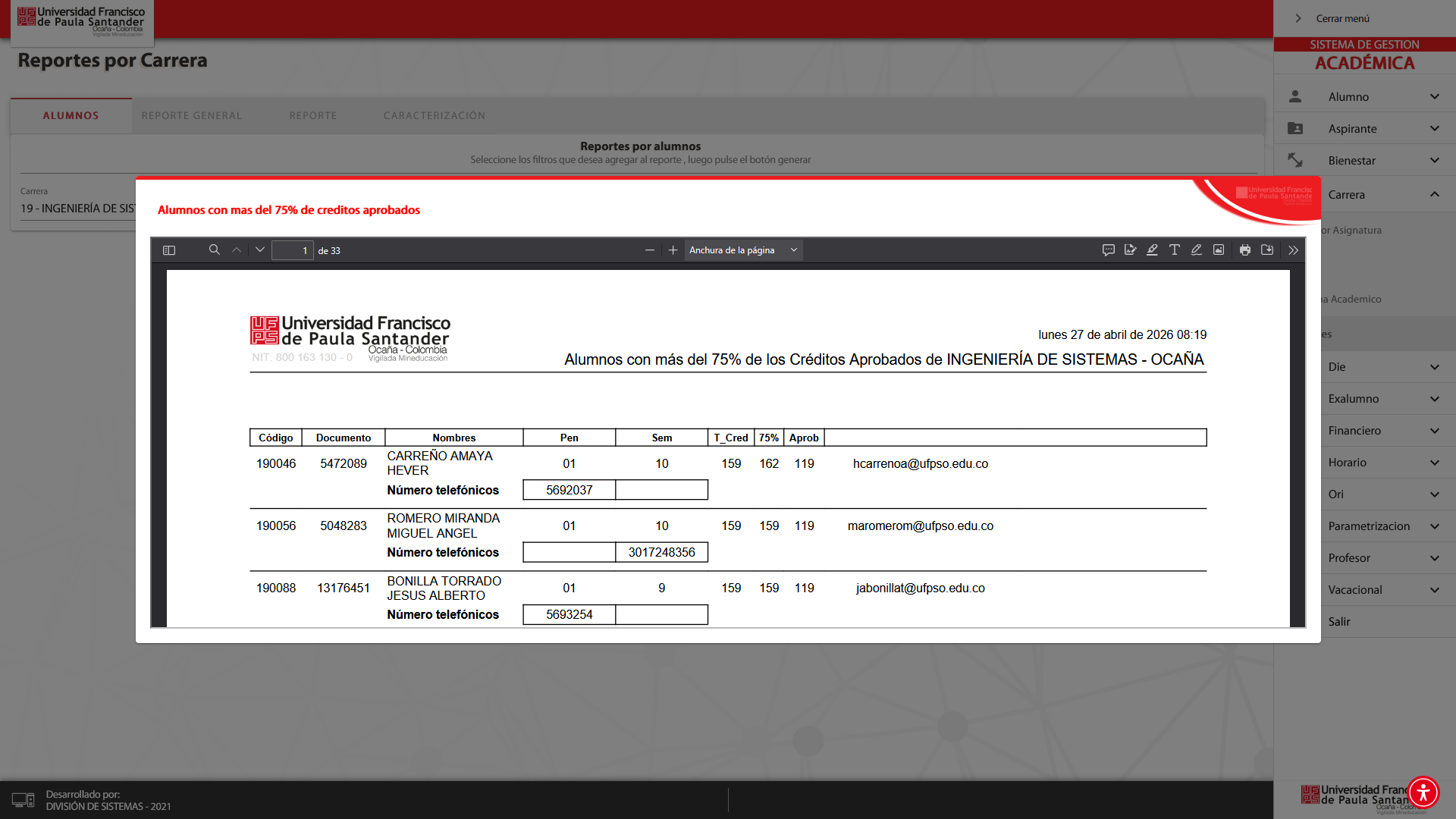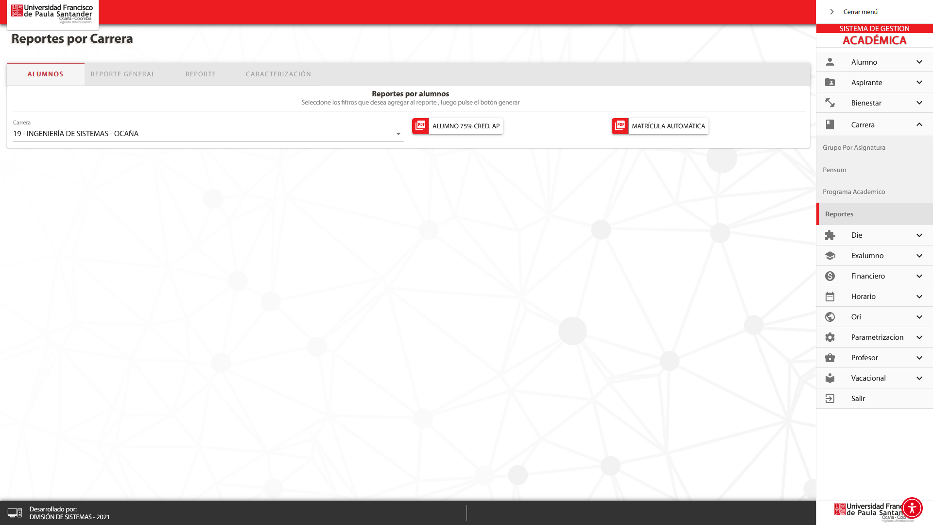 En esta sección se pueden generar reportes relacionados con los estudiantes, según la carrera seleccionada.
