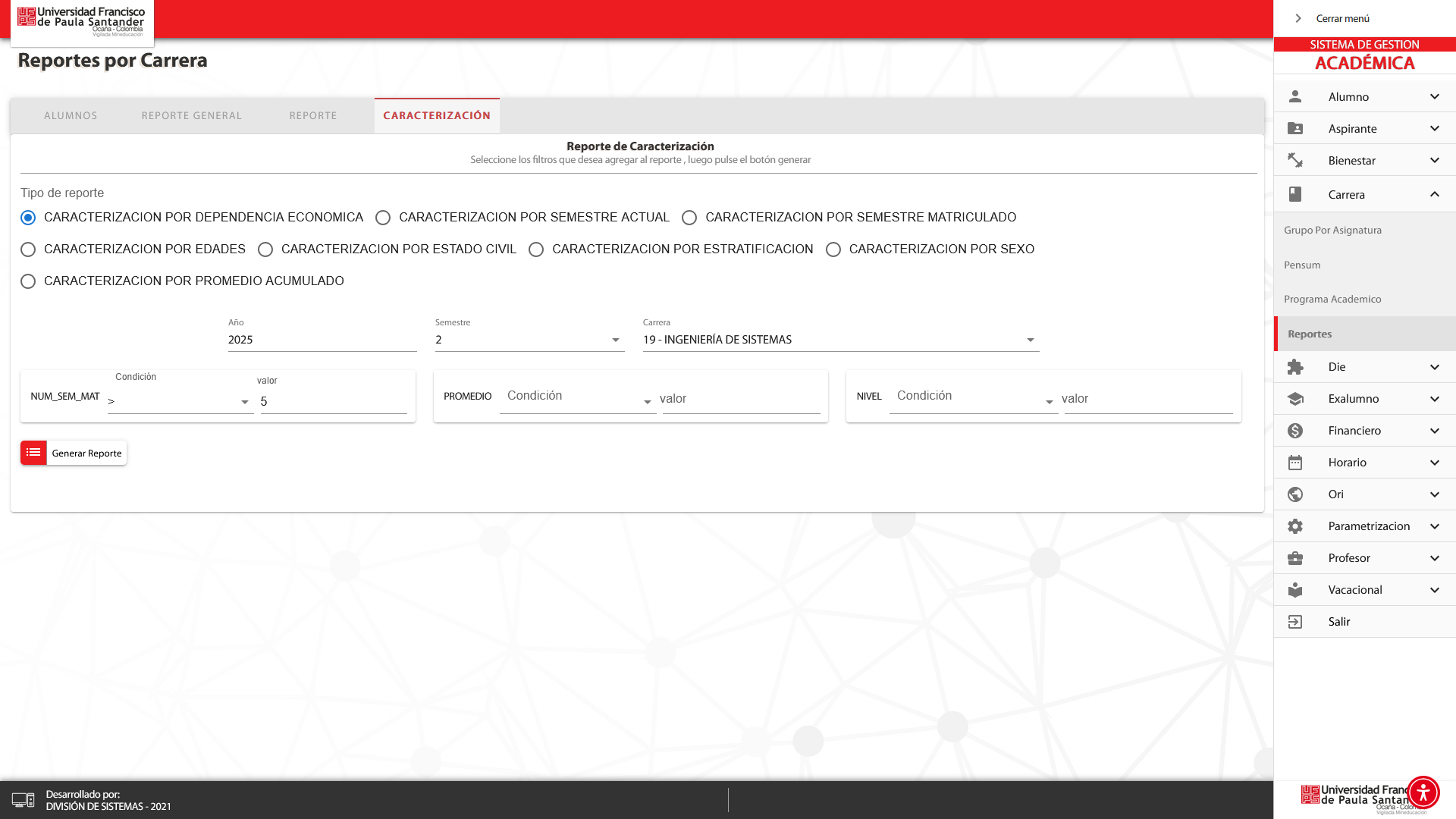 En este apartado encontrará cuatro secciones principales: Alumnos, Reporte General, Reporte y Caracterización, donde es posible generar diferentes reportes académicos.