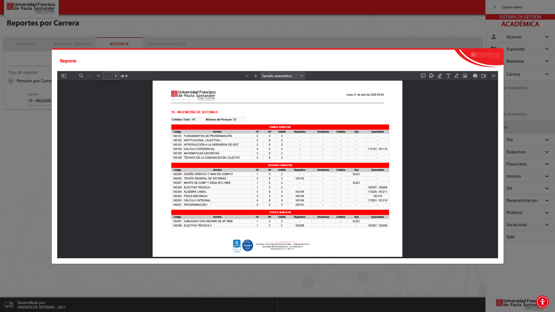 Una vez seleccionado este campo, el usuario podrá generar los reportes disponibles. Al elegir cualquiera de ellos, el sistema abrirá el reporte en formato PDF en una ventana emergente.