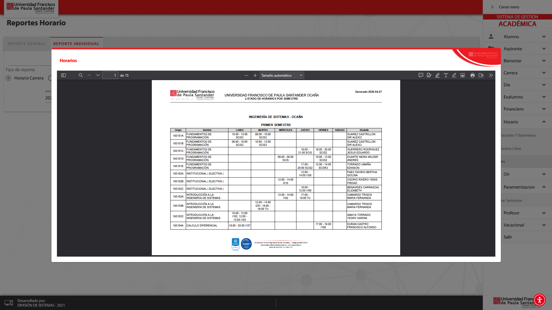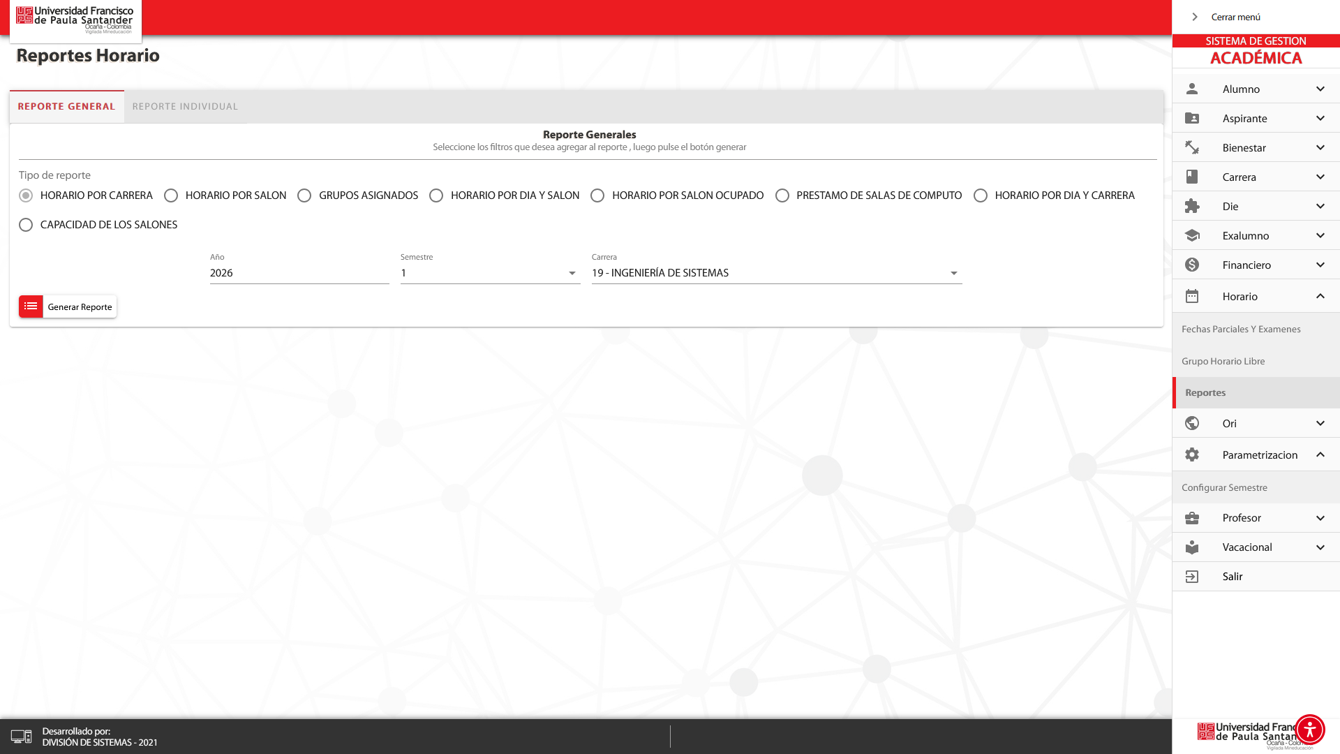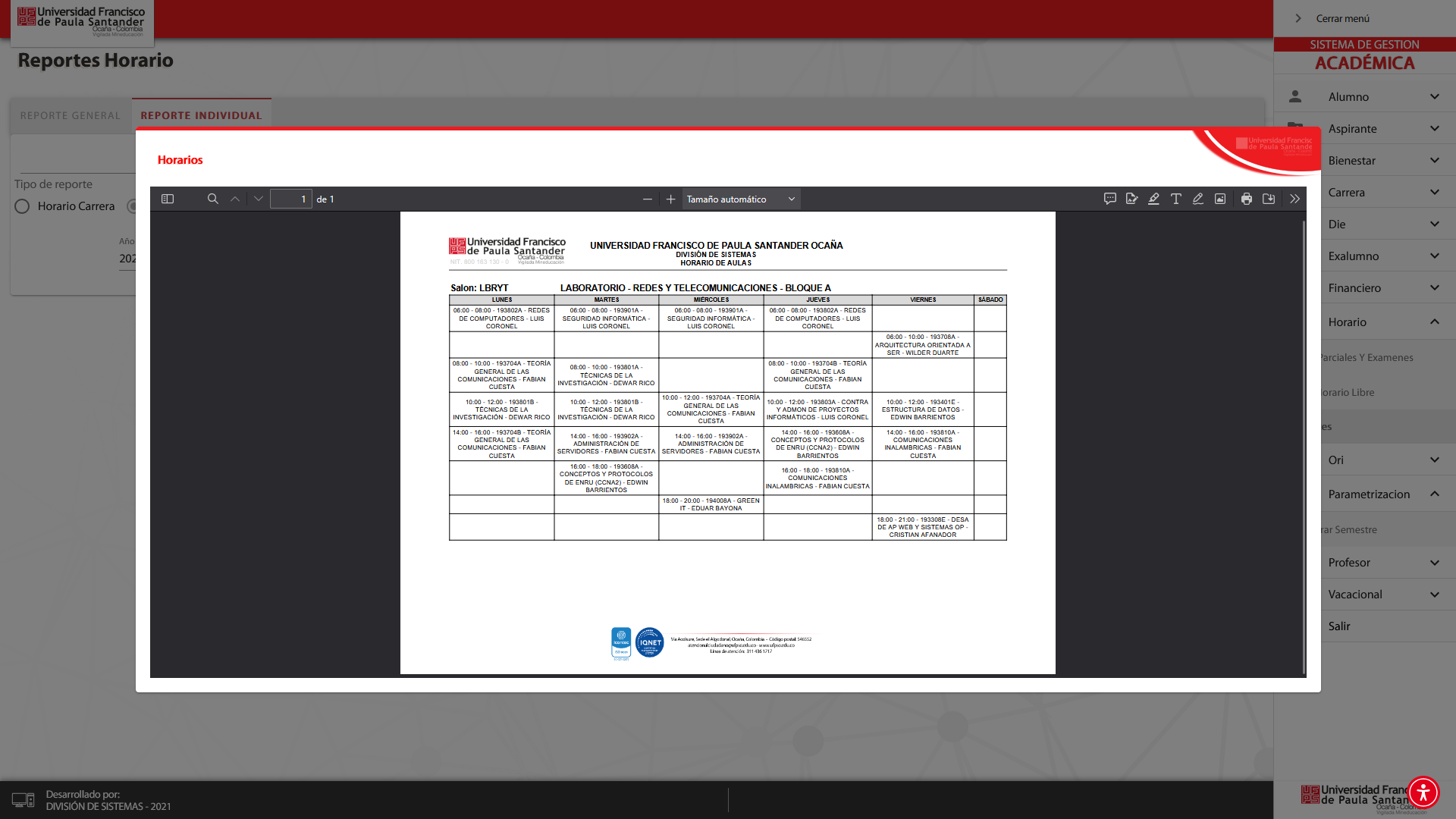 En esta sección es posible generar dos tipos de reportes de horarios: por carrera o por salón. Al generar cualquiera de estos reportes, el sistema abrirá una ventana emergente donde se visualizará el archivo en formato PDF.