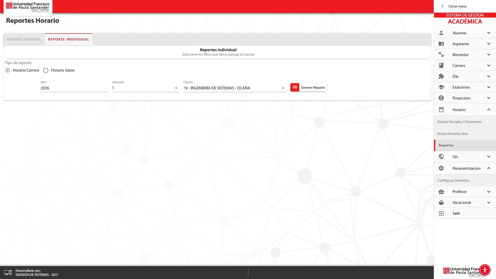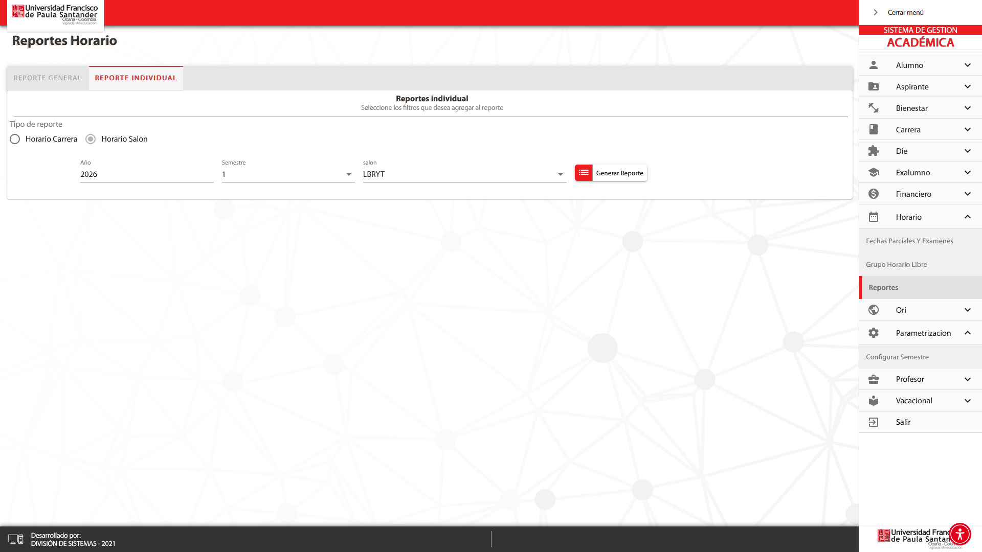 En este apartado usted encontrará dos secciones principales: Reporte General y Reporte Individual, desde donde es posible generar distintos reportes académicos.