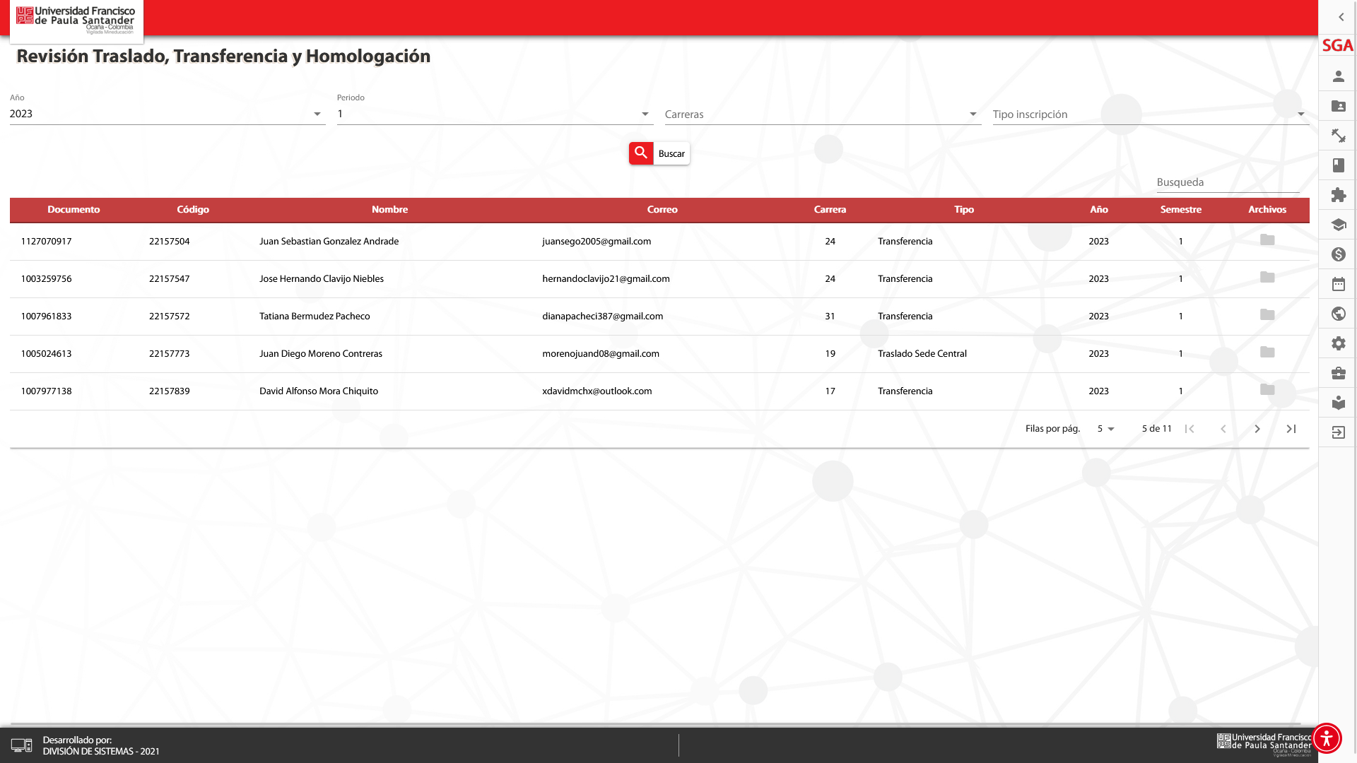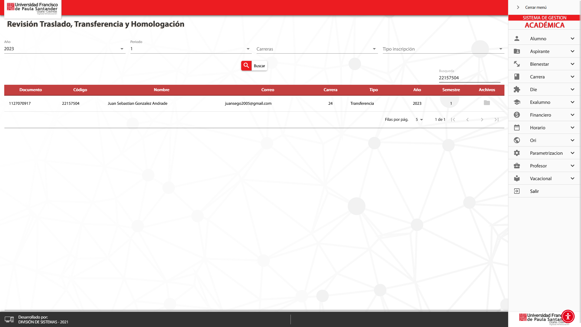 En este apartado se puede consultar la información de los aspirantes que hayan hecho traslado, transferencias u homologaciones, filtrada por año y semestre. Además, el sistema permite aplicar filtros adicionales para facilitar la búsqueda según las necesidades del usuario.