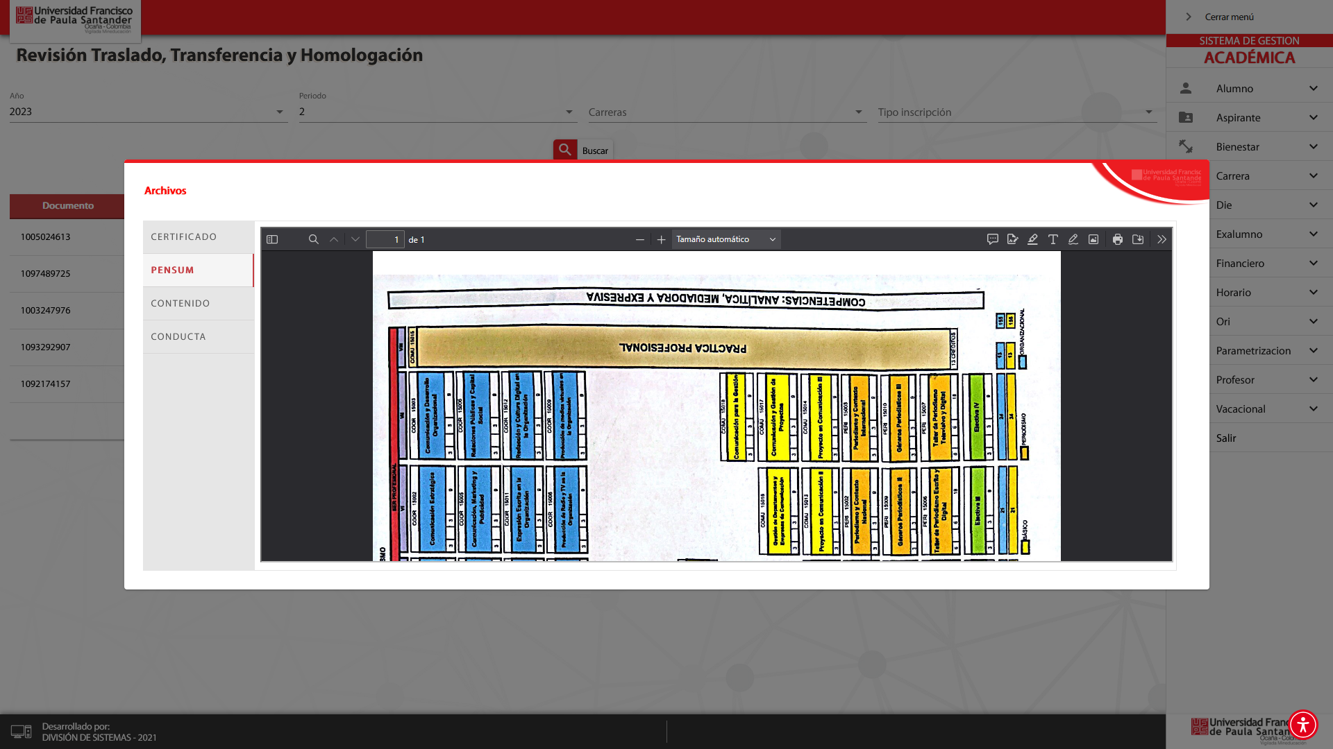 Por último, en la tabla de resultados, la última columna contiene un ícono de carpeta. Al hacer clic sobre este ícono, se abrirá una ventana flotante donde se podrán visualizar todos los archivos que el aspirante cargó durante su proceso de transferencia, traslado u homologación.