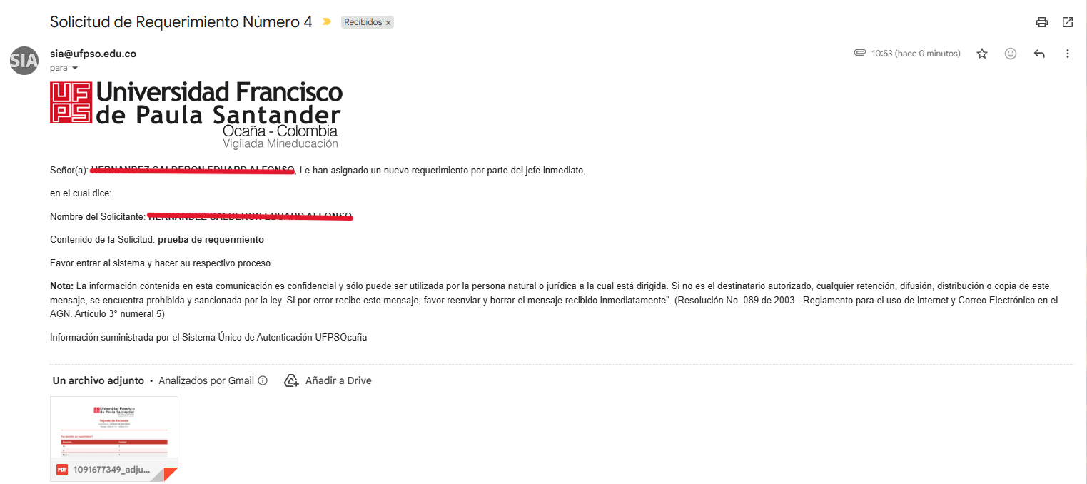 Al mismo tiempo el sistemas manda un correo a la secretaria de la dependencia, avisando de un nuevo requerimiento.