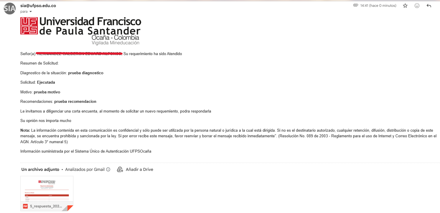 Una vez el funcionario responda la solicitud, este le llegara un correo avisando que fue ejecutada, y que deberá responder una encuesta desde el sistemas para ver si se le dio solución o no.