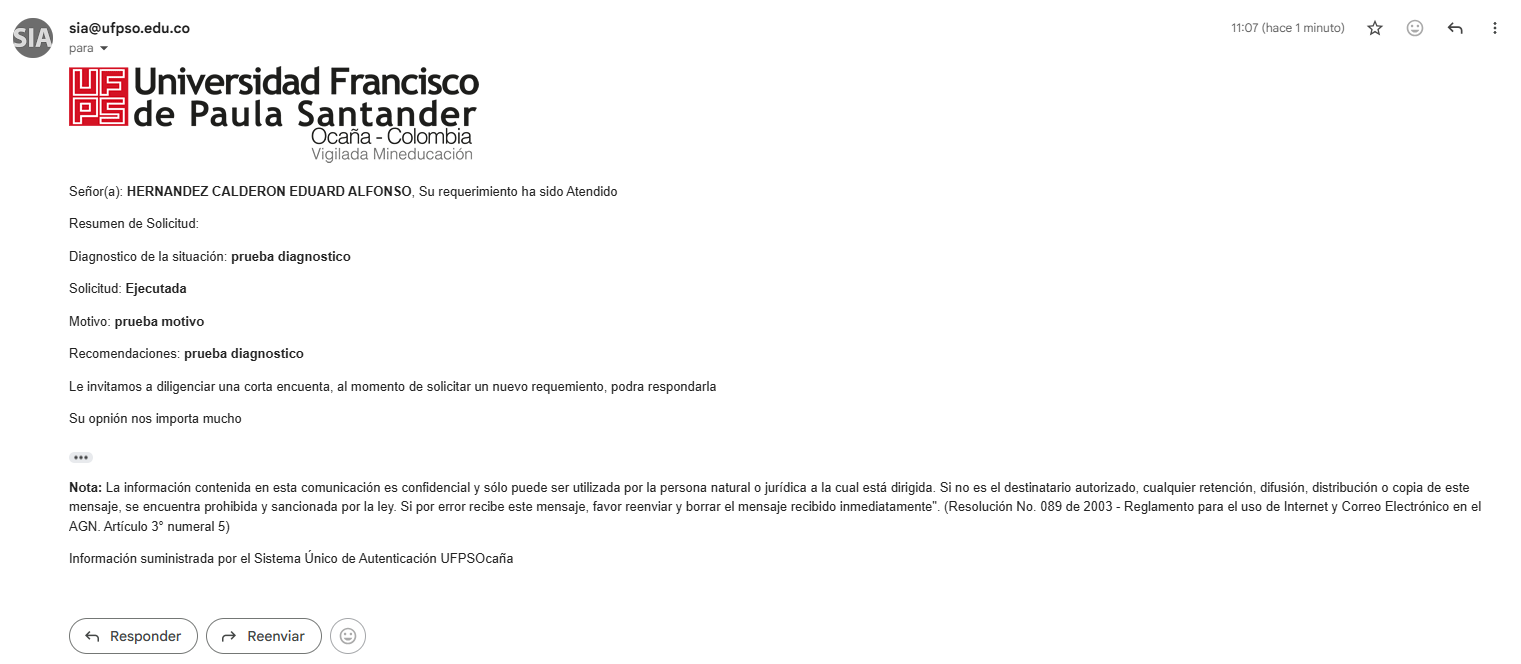 Una vez el funcionario responda la solicitud, este le llegara un correo avisando que fue ejecutada, y que deberá responder una encuesta desde el sistemas para ver si se le dio solución o no.