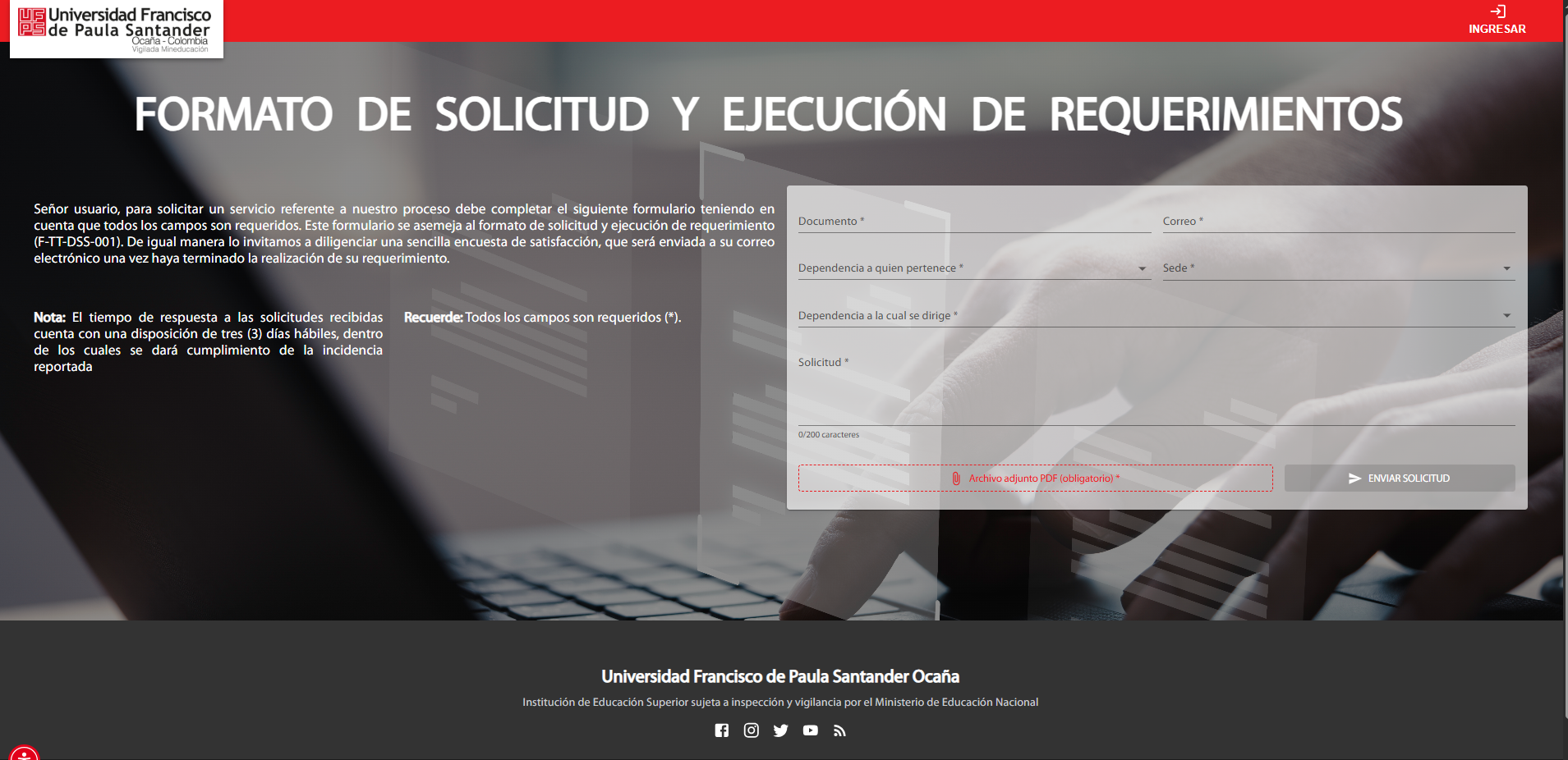 El Funcionario ingresa a la pagina requerimientos.ufpso.edu.co, esta le presentara la pagina Home del Sistemas que es para solicitar el requerimiento.