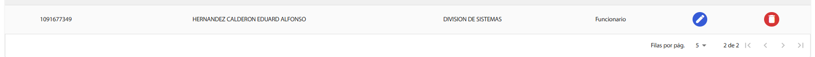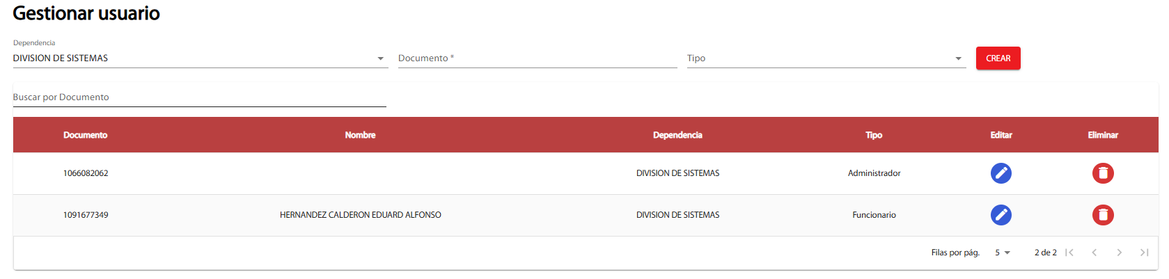 Este apartado solo tendrá acceso el administrador del sistema, ya que acá podrá gestionar todos los los usuarios, en ella se encuentra el CRUD de usuarios, Al entrar vera una tabla que en ella podrá seleccionar la dependencia para crear o filtrar los usuarios, además puede buscar por documento para validar su registro, y encontrara 3 botones, CREAR, EDITAR Y ELIMINAR.