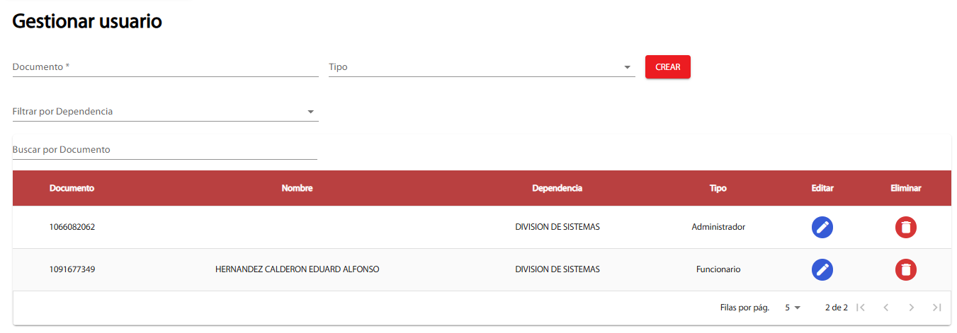 Este apartado solo tendrá acceso el administrador del sistema, ya que acá podrá gestionar todos los los usuarios, en ella se encuentra el CRUD de usuarios, Al entrar vera una tabla que en ella podrá seleccionar la dependencia para crear o filtrar los usuarios, además puede buscar por documento para validar su registro, y encontrara 3 botones, CREAR, EDITAR Y ELIMINAR.