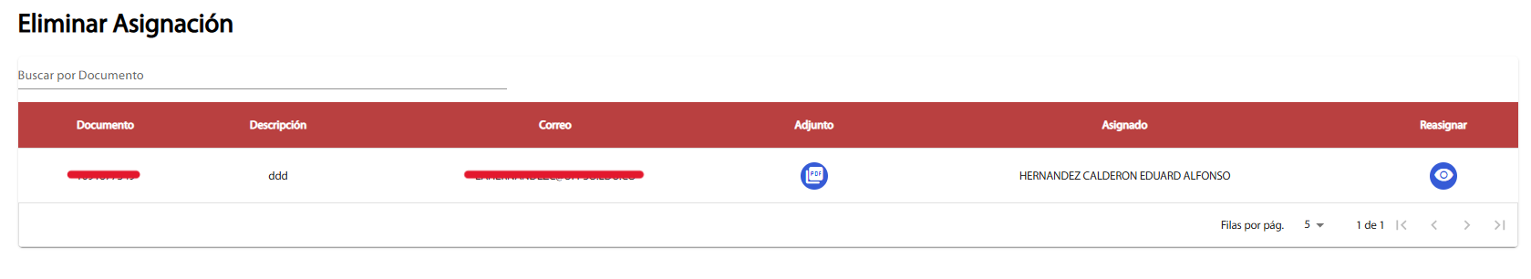 El en apartado de Reasignar, el usuario podrá Eliminar el asignado, para asignárselo a otro, de igual manera vera la misma información, lo único que cambia es el botón por Reasignar.