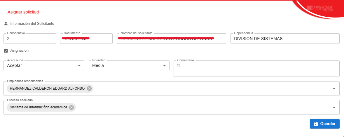 Si se quiere asignar aparecerá un contenedor mostrando el consecutivo, documento, nombre del solicitante y dependencia, eso lo autocompleta, ya lo que haría el coordinador es seleccionar la prioridad, dejar un comentario y seleccionar el empleado y proceso encargado, una vez asignado desaparecerá de la vista y vera un aviso de confirmación.