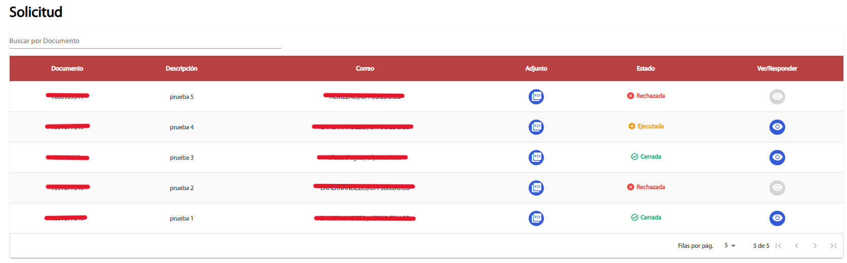 El en apartado de Solicitudes, el usuario podrá tener un seguimiento de cada requerimiento establecido a su dependencia a cargo, este podrá ver los estados en los que va dicho requerimiento, y podrá ver información como lo es el documento y correo del solicitante, descripción, estado y adjunto de la solicitud y ver la respuesta o incluso el mismo responder, y también puede filtrar por documento las solicitudes que quiera ver.