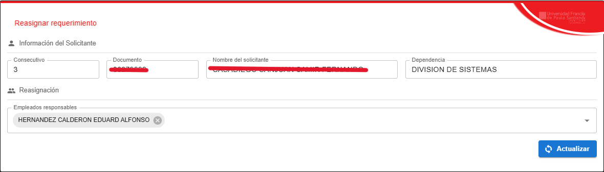 Al darle al botón de Reasignar este podrá cambiar solo el empleado responsable, para así dirigirlo a otro.