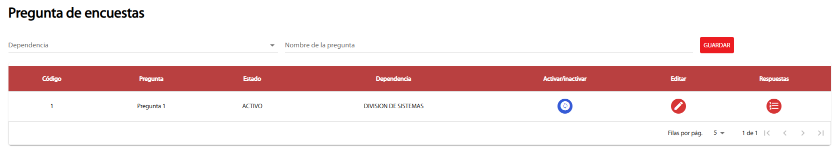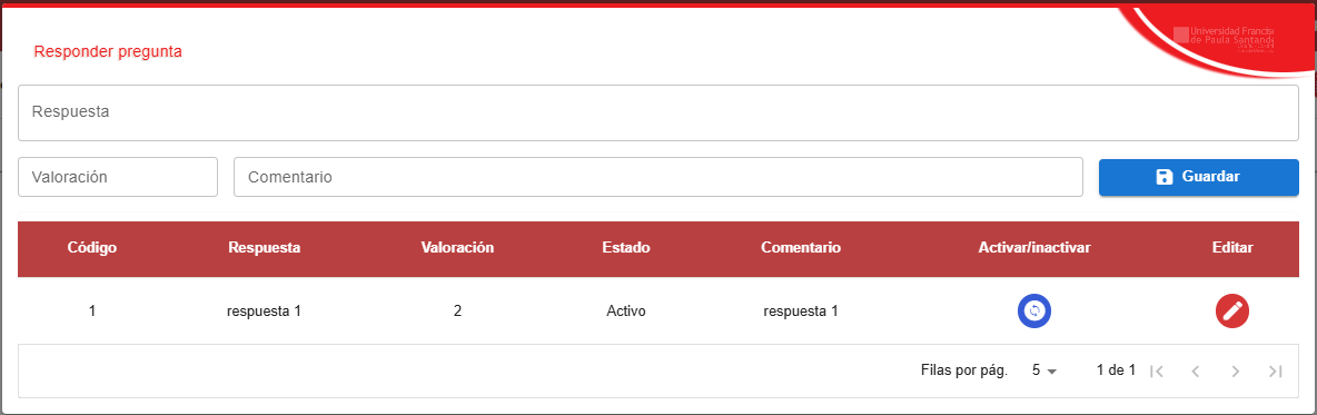 En el apartado de Respuesta podrá hacer lo mismo, activar o desactivar la respuesta, crear las respuesta que quiera tener la encuesta o editarlas si le parece.