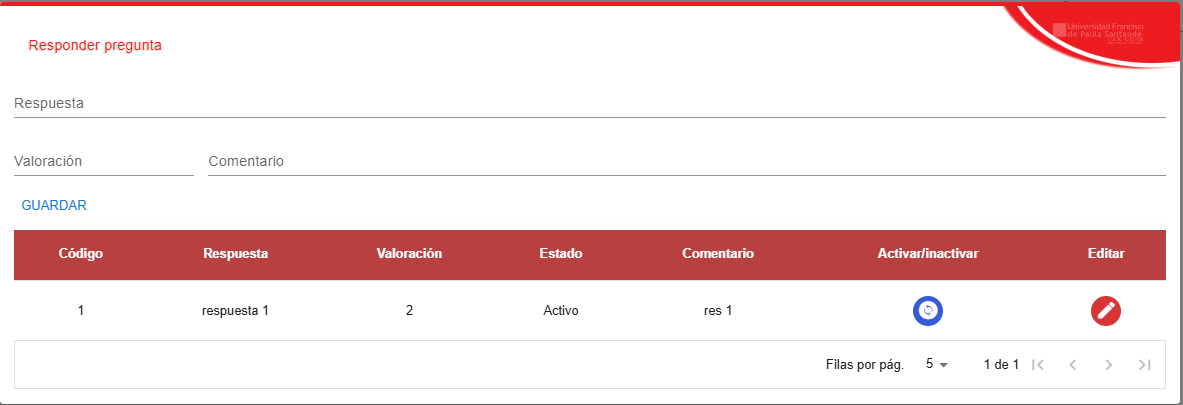 En el apartado de Respuesta podrá hacer lo mismo, activar o desactivar la respuesta, crear las respuesta que quiera tener la encuesta o editarlas si le parece.