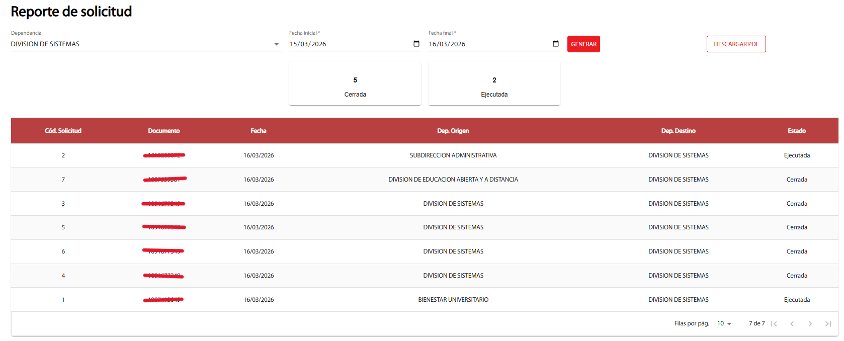 Así mismo vera un botón de DESCARGAR PDF, el cual le permitirá descargara un PDF, valga la redundancia, en el que podrá visualizar mejor la información, cabe resaltar que puede descargarlas todas, sin importar el estado, pero si quiere descargar las solicitudes por estado, simplemente da click al estado que quiera visualizar y le da en DESCARGAR PDF.
